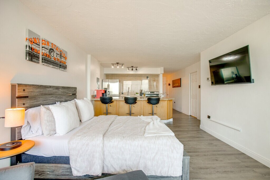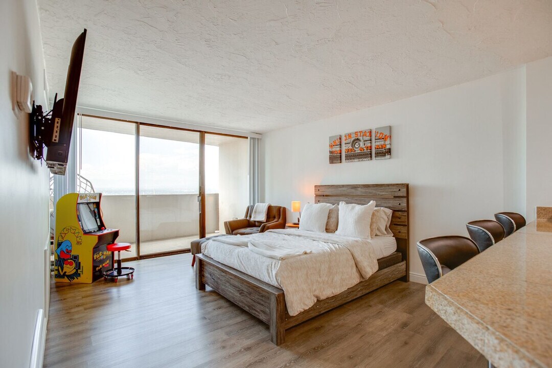 Feel at home in this high-rise retreat in the heart of the Mile High City! Perched on the 29th floor of the Brooks Tower Residences with step-free entry via elevator, this single-story studio offers beautiful mountain and city views. This studio features a mountain-view balcony, a Smart TV, and an arcade machine. The kitchen is equipped with a refrigerator, stove/oven, dishwasher, Keurig, blender, toaster, microwave, cooking basics, dishware and flatware, and counter seating. Community amenities include a seasonal rooftop pool, rooftop deck with lounge area, dining and gas grills, gym, meeting room/workspace, and coin-operated laundry facilities. Linens and towels, an iron and board, complimentary toiletries, a hair dryer, a closet, a shoe rack, hangers, and a 3-compartment rolling laundry bin are provided. Paid parking lots are located nearby and parking recommendations are available upon request. Walk to Larimer Square and it's just 1/2 mile to Union Station. No events, parties, or large gatherings are allowed. [SI]