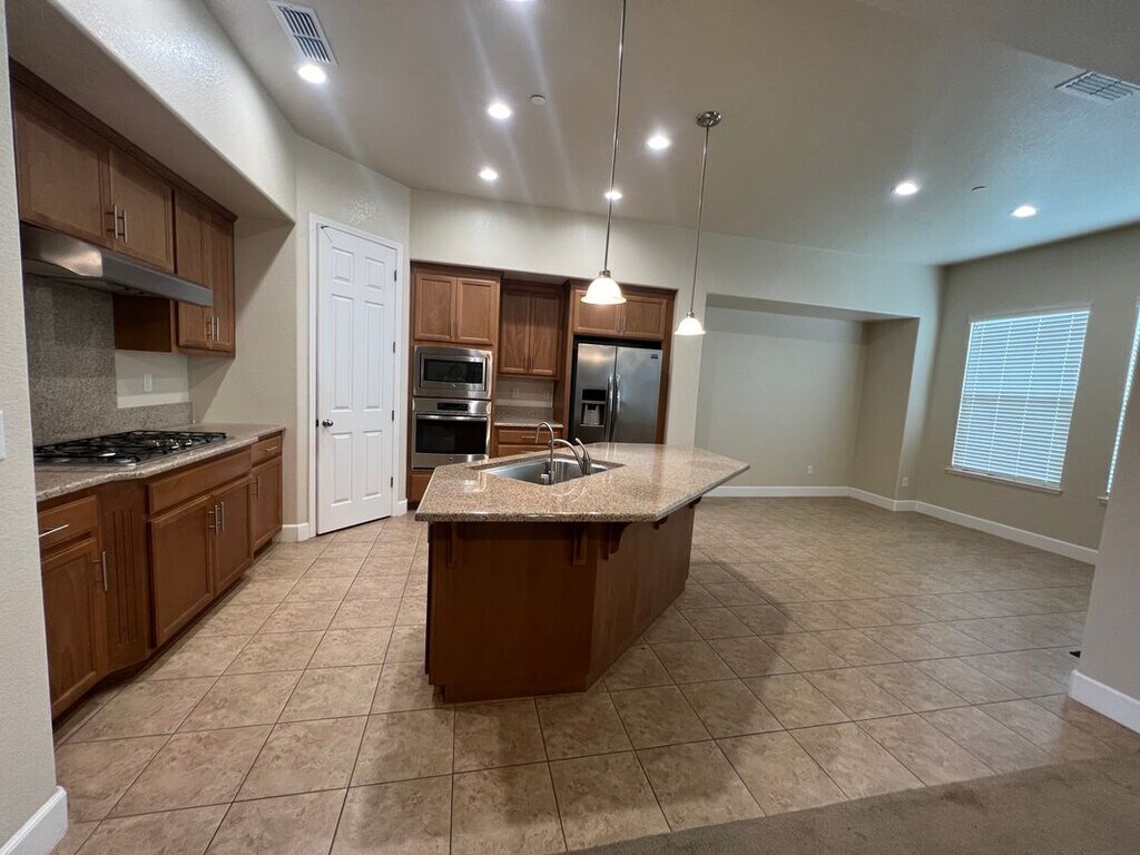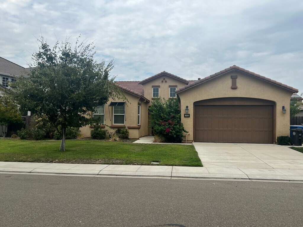 Available Now- Turn key and spacious single story home in Union Ranch. 3 bedrooms, 2 baths home has just under 1900 square feet. It has an open concept living area. Kitchen boasts with granite counter tops, dining area and stainless steel appliances including refrigerator. Split floor plan adds additional privacy. On the west wing of the home features a large bedroom with walk in closet, added linen closet space and full bath. 3rd bedroom can be used as a den or office. Large primary bedroom has a private bathroom with expanded stall shower, double vanity and walk in closet. Overhead lighting throughout with ceiling fans in each bedroom and living area. Laundry room comes equipped with a full sized front load washer and dryer. Back yard is fully landscaped with a covered patio space. Home is located convenient to HWY 99 access, shopping and schools.