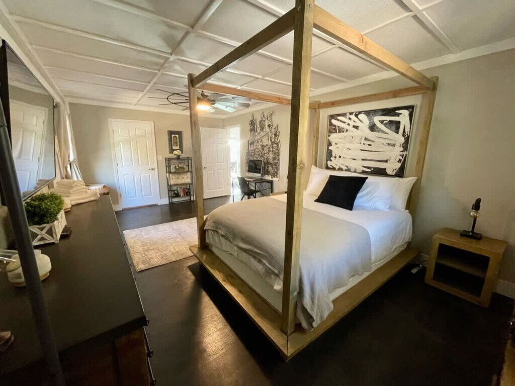 Experience a perfect blend of luxury and comfort with this 4-bedroom oasis. Nestled in the heart of Bentonville, this haven is ideally located for art enthusiasts, cyclists, and family getaways. Delight in world-class museums, illustrious biking trails, and gourmet eateries, just steps from your door. This dog-friendly abode, replete with upscale amenities, promises an unforgettable retreat to immerse yourself in the vibrant culture of Bentonville. Welcome to this luxurious haven where Bentonville's rustic charm meets sleek modern aesthetics. Within this four-bedroom oasis, contemporary comforts harmonize with a whisper of homeliness to create a perfect vacation spot for your family or group. Step into the vibrant living room shimmering with natural light reflected off polished wooden floors. Revel in relaxation or entertainment as comfortable sofas beckon you to the glow of a large flat-screen TV. Venture further to discover a fully equipped, modern kitchen seamlessly extending from the living room. Whip up your home-style meals, courtesy of the essential appliances and cookware. A coffee maker awaits your mornings, and a dishwasher takes care of the aftermath. When it's time to retire, each of the four bedrooms introduces you to tranquility redefined with plush queen beds, ample storage, and warm décor. The bathrooms receive a touch of luxury with standing bathtubs for unwinding. Beyond the indoors, a tranquil outdoor space awaits with a patio, BBQ party setup, and a fire pit under Arkansas' brilliant sky. For those combining business with pleasure, a dedicated workspace is provided, complemented by high-speed WiFi, free parking for up to three vehicles, air conditioning, heating, laundry amenities, a smart lock, and a single-level layout for easy mobility. We welcome up to two house-trained dogs with a small fee of $75 per pet per stay. Unfortunately, we are unable to host cats at this time. This prime location in downtown Bentonville puts you right at the center of the action. Stroll or ride to the historic square less than a mile away, or immerse yourself in Bentonville's illustrious heritage at the Walmart and Native American History Museums. The Crystal Bridges Museum of American Art and Osage Park are a stone's throw away for your cultural indulgence. Experience the vibrant biking trails teeming with lush greenery, a unique thrill for bike lovers. Bentonville is known for its biking-friendly community, so be sure to explore on two wheels whenever you can. Otherwise, parking for two to three cars is available, and Uber and Lyft operate in the area. Quiet hours are from 9:00 PM to 8:00 AM, so please be mindful of neighbors. Only registered guests are allowed, and approval is needed before inviting others. Up to two well-behaved dogs are welcome with a fee of $75 per pet per stay. Please clean up after them and keep them off the furniture. No smoking or vaping indoors; use designated outdoor areas and dispose of cigarette butts properly. Do not tamper with WiFi routers, security cameras, or smart devices. Park only in the driveway, which fits three vehicles, and do not park on the street or neighbors' property. Report any damages or maintenance issues immediately for assistance. Includes a dedicated workspace complemented by high-speed WiFi. [SI]