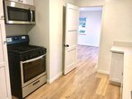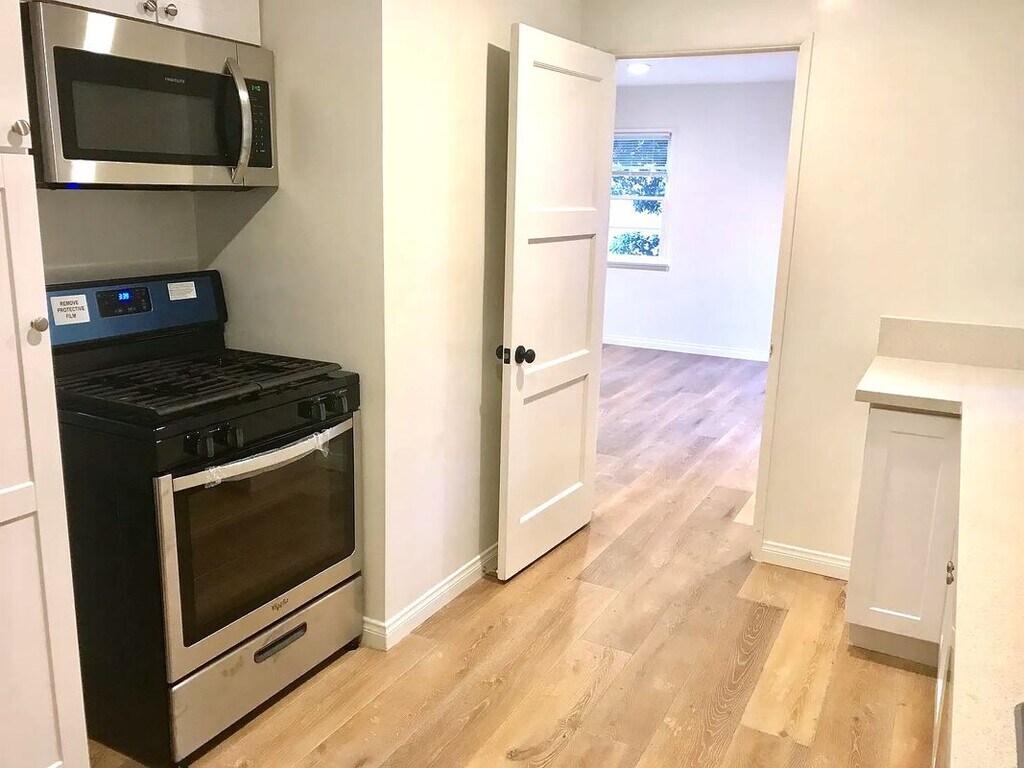 Prime North of Wilshire. Lower unit of triplex, spacious one-bedroom, one-bathroom in prime location. Hardwood floors, newly remodeled bathroom just completed, stainless appliances (dishwasher, microwave, range, fridge), recessed lighting, window shades and drapes. Eat-in kitchen, A/C, inside access to attached laundry and attached enclosed private electric garage with remote and storage. Unit opens up to beautiful shared courtyard. Private setting, unique opportunity. Walk to Montana Ave. restaurants and shops. Roosevelt Elementary and Lincoln Middle schools. Available now. Owner pays for water, sewer, trash, and gardener. Tenant responsible for gas and electric.