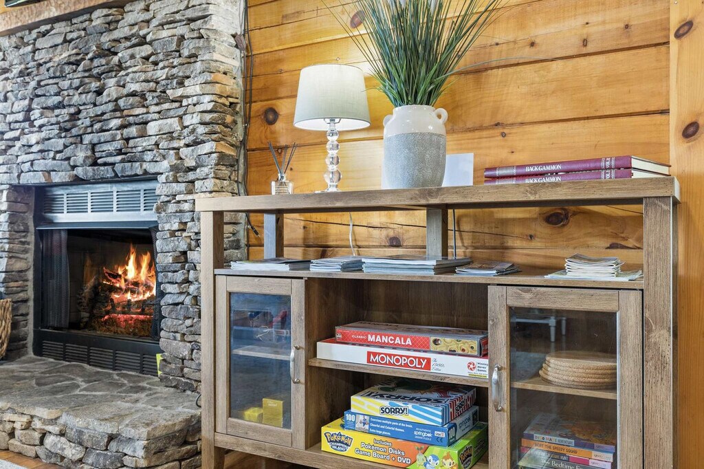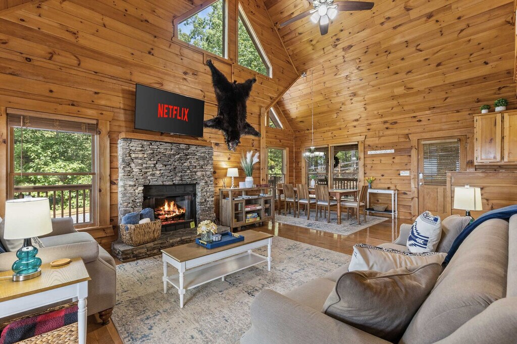 Feel at home in this 3-bedroom cabin nestled in the peaceful North Georgia mountains in Morganton, GA. This 3-level luxury cabin comfortably accommodates up to 6 guests and has everything you need for an amazing vacation. The cabin features warm wood interiors and open living spaces. The fully stocked chef’s kitchen has high-end stainless appliances, a large refrigerator, ample cabinetry and cooking space, and a coffee maker (Keurig and drip). The living room has a 60” Smart TV, a large plush sofa, an indoor fireplace, and a high vaulted ceiling. The game room is complete with a wet bar, a pool table, and a private sauna. Outdoor amenities include an expansive deck with stunning mountain views, a hot tub, a fire pit, an outdoor patio/dining area, a BBQ grill, and ample outdoor seating. There are TVs in each bedroom, a washer and dryer, and board games. Renting a car is a convenient option to explore the area. Rideshare services like Uber and Lyft are readily available. Nearby attractions include Morganton Point Recreation Area (Lake Blue Ridge), just 5 miles away, Tank Town USA, only 7 miles away, Project Chimps Sanctuary, located about 10 miles away, Hooves & Feathers Petting Farm, around 8 miles away, and Stanley Gap Trail / Benton MacKaye Trail, roughly 11 miles away. Restaurants include Cucina Rustica (Morganton), about 5 miles away, La Pizzeria at Cucina Rustica, just 5 miles away, The Cove Fish Camp, located 6 miles away, Nomad Market of Morganton, only 4 miles away, and Southern Charm Restaurant (Blue Ridge), around 9 miles away. Check-in is at 4pm and check-out is at 10am. No pets are allowed. No parties are allowed—violations may result in immediate termination of the stay. Parking is available for 3 vehicles in the driveway. Street parking is not allowed. Guests must be 21 years or older to book this property. [SI]
