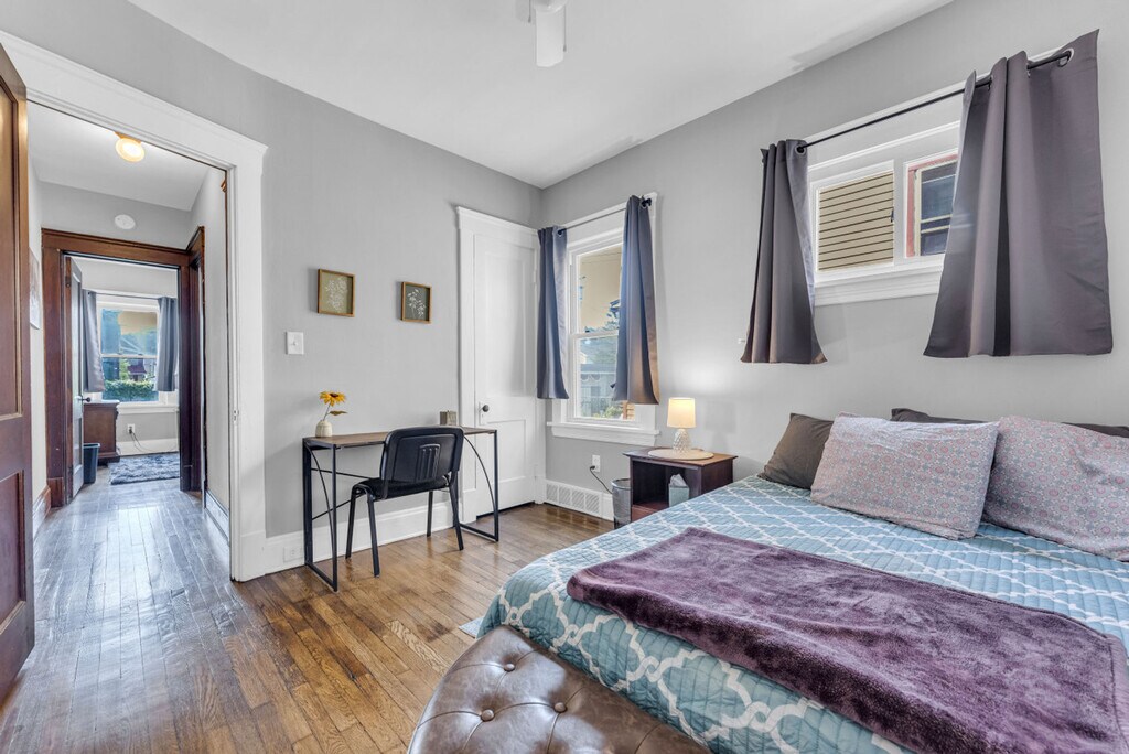 Feel at home in this beautifully renovated downstairs unit of a duplex on Bernard Ave, blending modern comfort with timeless charm. This bright and stylish apartment features a living room with a comfy couch (which converts to a bed for extra guests) and a papasan chair, a dining room with a formal dining table and built-in bench, and a fully remodeled bathroom with elegant tile and a tub/shower combo. The shelves are stocked with board games and fun extras. The shared backyard and basement include a washer/dryer for your convenience. Up to two dogs are welcome for a flat fee of $125. Requests for a third or fourth dog require approval for an additional $100. This duplex unit offers comfort and style, perfect for couples, small families, remote workers, or friends traveling together. Relax on the front porch, furnished with chairs and a small table. Please keep noise to a minimum when outside, especially during quiet hours from 10 PM to 8 AM, as excessive noise may result in a $500 fine. No smoking is allowed inside the house, and violations will incur a $500 fine. Underage drinking, drug use, parties, large gatherings, and unauthorized guests are strictly prohibited. Please avoid confetti, glitter, water beads, balloons, or any tiny plastic, glass, or metal pieces. Pets must be disclosed and approved in writing before your stay, or a $150 fee may be applied, and the stay may be canceled without a refund. No cats are allowed. Please remove shoes indoors to keep the home clean. Open the bathroom window halfway to 2/3 down or keep the bathroom fan on during showers and for 20–30 minutes afterward to prevent moisture buildup. The second bedroom features a full-size bed and a dedicated desk with basic office supplies, making it a great spot for remote work or study. [SI]