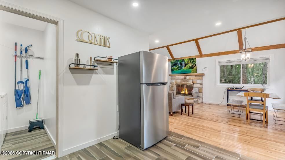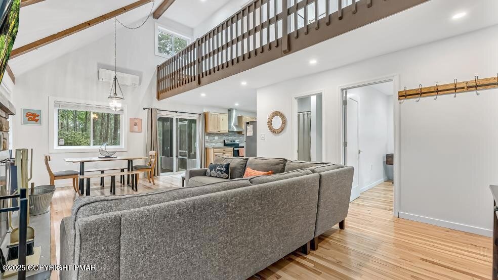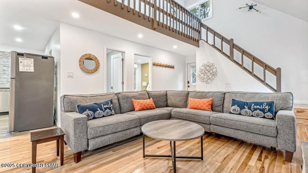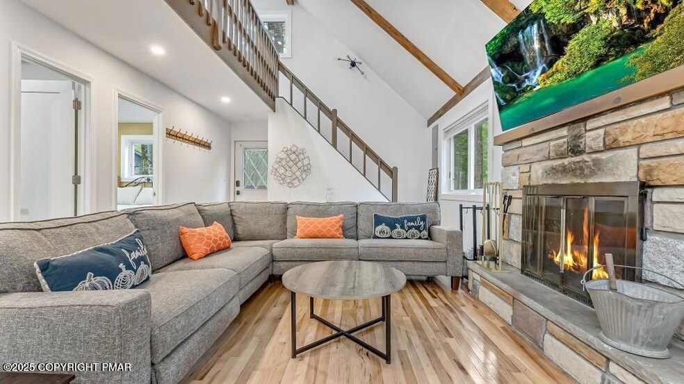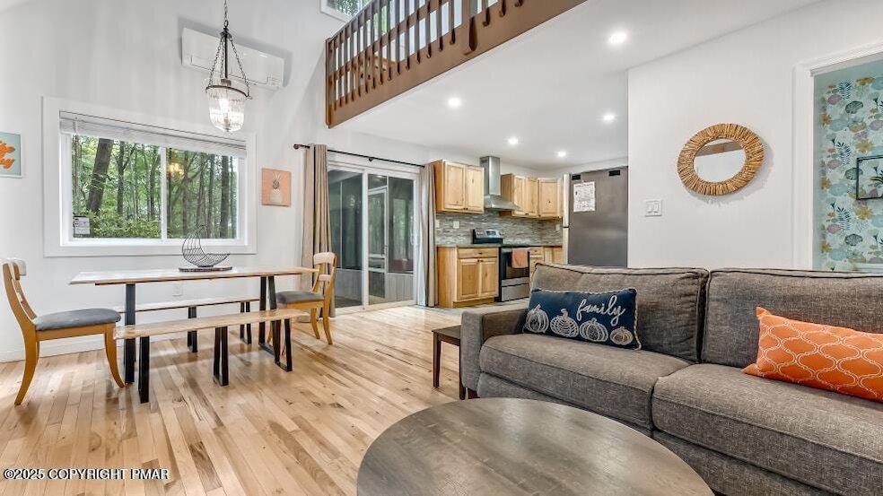 Cozy chalet in the highly sought-after Locust Lake Village community. This home underwent a complete gut renovation in 2022 and blends rustic charm with modern upgrades. Soaring vaulted ceilings with exposed beams create an open, airy feel, while wood cabinetry, granite countertops, and stainless steel GE appliances add a touch of elegance to the kitchen. Oak hardwood floors throughout, two new bathrooms with stone flooring. Upgrades include Hype Heat Mitsubishi split units,