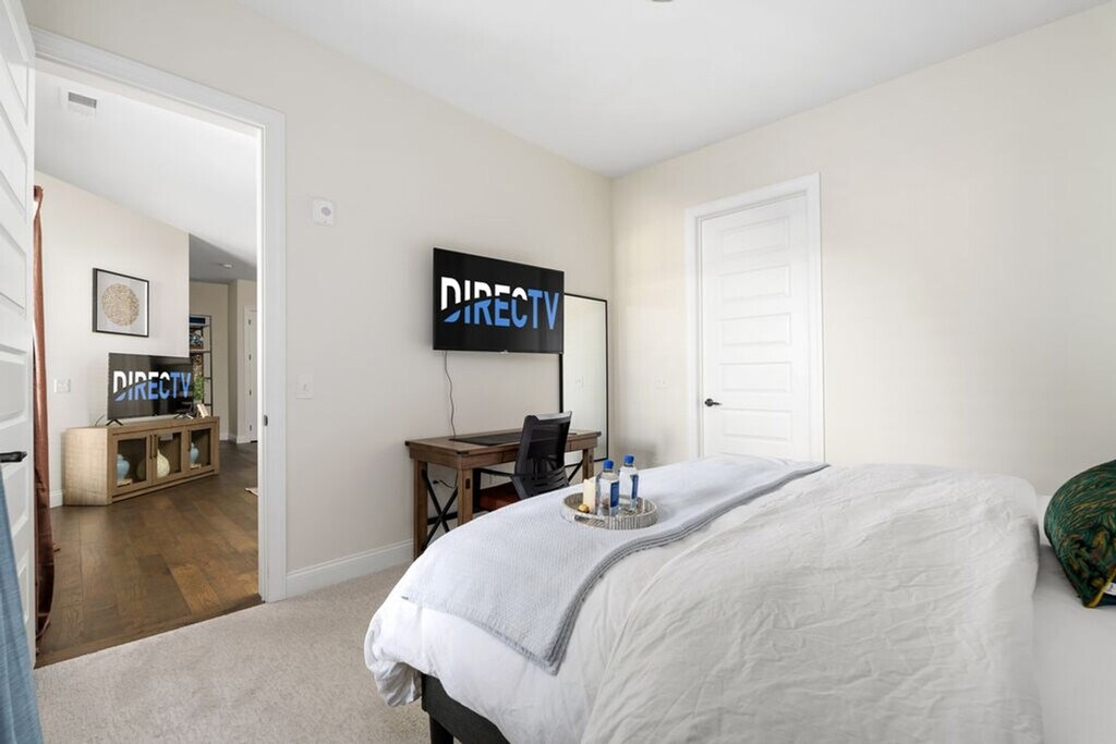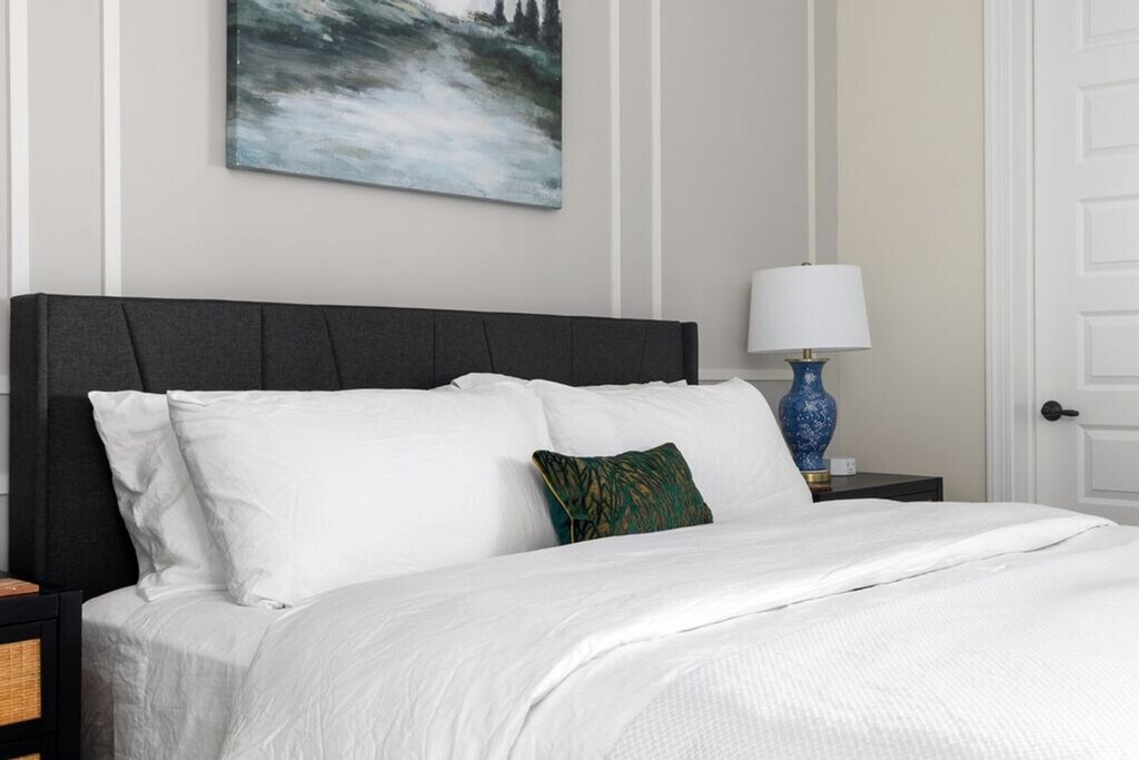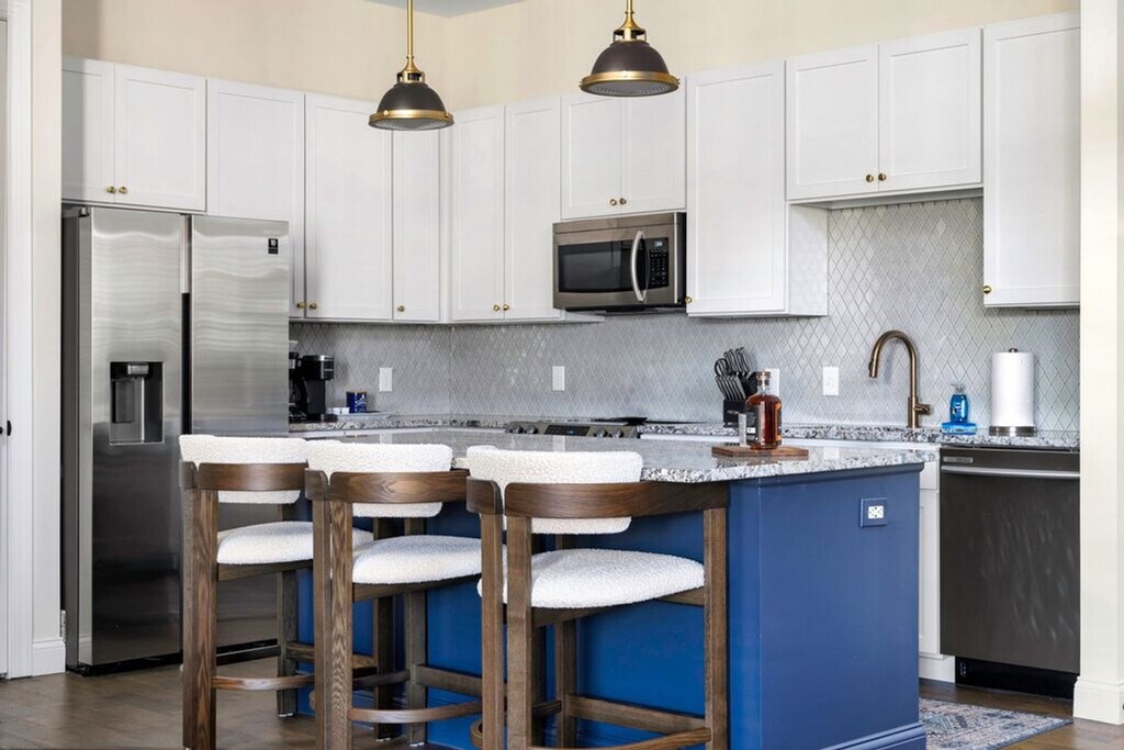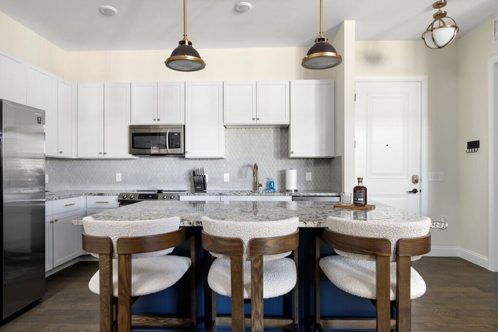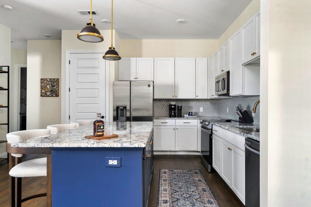 Feel at home in this unique two-bedroom apartment located on the top floor of a secure building with elevator access. With a king-size bed in the master bedroom and two twin beds in the guest room, this spacious 1191 sq ft apartment offers a cozy living experience. Enjoy the convenience of free garage parking and a private balcony with seating, perfect for relaxing and taking in the courtyard views. The apartment boasts a large, open-concept living area with tall ceilings and a modern kitchen fully stocked for gourmet cooking. The kitchen features a massive island with granite countertops and designer barstools, along with extras like three types of coffee makers, a Crock Pot, and a blender. The living room is stylishly furnished with a custom emerald green sofa and a 55" TV powered by ROKU, offering access to streaming channels and DirecTV. The master bedroom includes a dreamy king-size bed with luxury linens and an ensuite bathroom with a walk-in shower. The guest bedroom, located on the opposite side of the apartment, features two twin beds and a spacious walk-in closet. A separate laundry room with a full-size washer and dryer is also available for your convenience. Enjoy complimentary access to the building's gym and free garage parking. Please note that pets are not allowed inside the apartment due to premium furniture. Nestled in the heart of The Short North within the Luxe23 community, this apartment offers an unbeatable walkable location. You'll find yourself steps away from the city's best restaurants, bars, coffee shops, and boutiques, ensuring you're never bored during your stay. This is a 100% smoke-free community, and smoking is not permitted anywhere, including on balconies. Pets are not allowed inside the apartment at any time. Check-in details will be provided after a quick ID verification process, which takes approximately 2 minutes. The master bedroom includes an office desk and chair, along with a 50" Smart TV for easy viewing from bed, making it ideal for remote work. [SI]