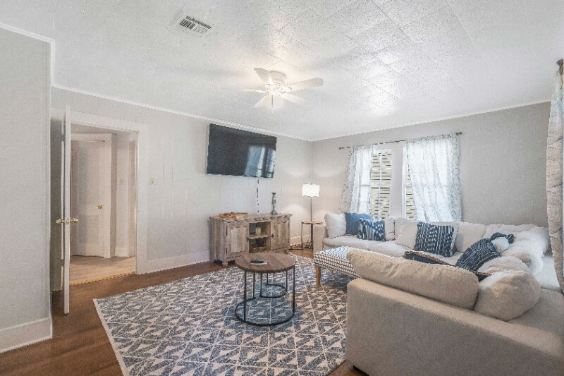 Property Id: 2092033 Newly renovated charming home in the middle of Lafayette but located in a quiet neighborhood setting. At our Mid-city home, find comfy king-sized beds in both bedrooms; a huge living room with a large, plush sectional for watching the 65 Smart TV; a gorgeous sunroom with loads of natural light; a well-stocked kitchen; and thoughtfully selected dcor throughout. If you want to head outside, you can hang out in the big backyard! Welcome to Miss Mary's Mid-city Cottage! This Tudor style home has been updated to create a cheery and comfortable space so visitors can have an opportunity to explore Lafayette and the surrounding Acadiana area from our can't beat location. Not only can you get to most places in Lafayette in under 10 mins but you are also less than a mile from the Cajundome and Cajun field. Start off your day with some freshly brewed coffee in the sunroom as you plan your day. You can enjoy the TV there as well. At the end of the day, come back to your spacious living room and relax on our super comfy couch while you watch the equally large Smart TV! We have a dedicated workspace for you in a nook of the living room - and you'll have super speedy internet access with fiber to the home. The two bedrooms have brand new king sized beds, blackout curtains, generous closets as well as dressers. The bathroom has all your amenities as well. Our outdoor space features a fenced in yard and patio set! **appx 1 mile to Oshcner medical facilities **quick 6 min drive or Uber to downtown or ULL (Unv of LA @ Lafayette) (2.4 mi) *less than 1 mi to Cajun field and the Cajundome/Conference Ctr (easy walk to events) *easy access from 1-10 and appx 15 mins from Lafayette Regional Airport *2 grocery stores with 1 mile Generous parking. **to promote sensible energy usage, we have set a generous cap on electricity usage - overage to be paid by guest Washer and dryer are in a storage shed just outside the main entrance door to the home (which is on the side of the house)
