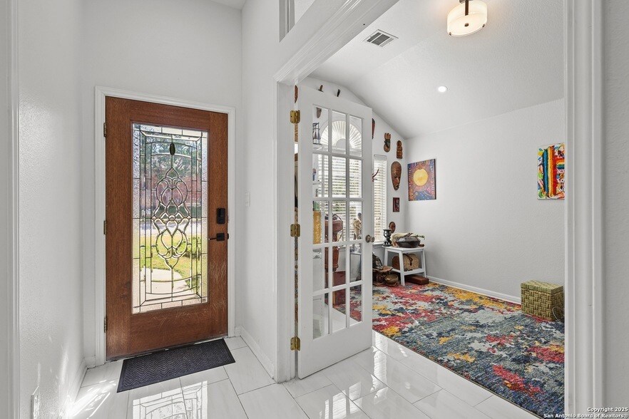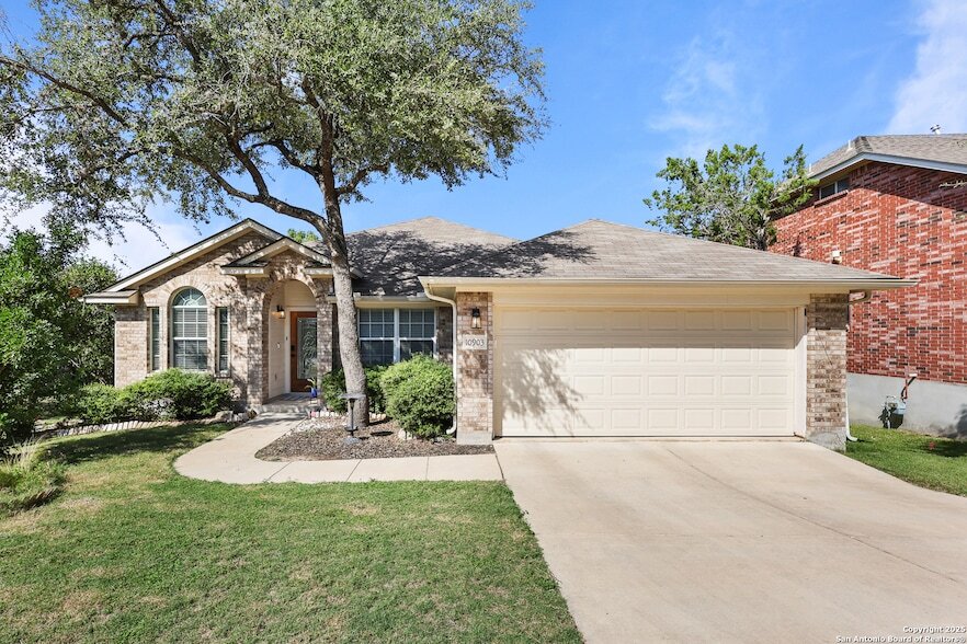 Welcome to 10903 Wilson Oaks, a beautifully updated home in a gated community off Prue Road in San Antonio. This 3 bedroom, 2 bathroom residence offers 2,255 square feet of thoughtfully designed living space, including a dedicated office at the front of the home that is perfect for remote work or study. The inviting living room features a cozy fireplace, while the remodeled kitchen is a chef's dream with an island, abundant cabinets, granite countertops, stainless steel appliances, and gas cooking. The spacious primary suite includes a remodeled bath with dual vanities and a large walk-in shower with two shower heads, creating a spa-like retreat. All bathrooms have been tastefully updated with modern finishes. Enjoy year-round outdoor living with a covered patio that wraps around the side of the home and a wooden deck that is ideal for entertaining or relaxing. This property backs up to a greenbelt for added privacy and tranquility. Residents love the direct access to the Leon Creek Greenway Trail system just down the road, connecting to Salado Creek for miles of biking, jogging, and nature walks. The location is also convenient to top shopping and dining at Bandera Pointe, as well as local schools and community amenities. This home combines modern upgrades with a prime location, offering the best of both comfort and convenience in San Antonio.