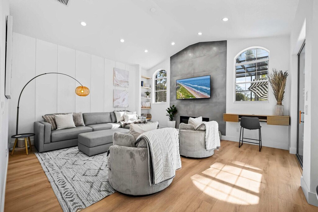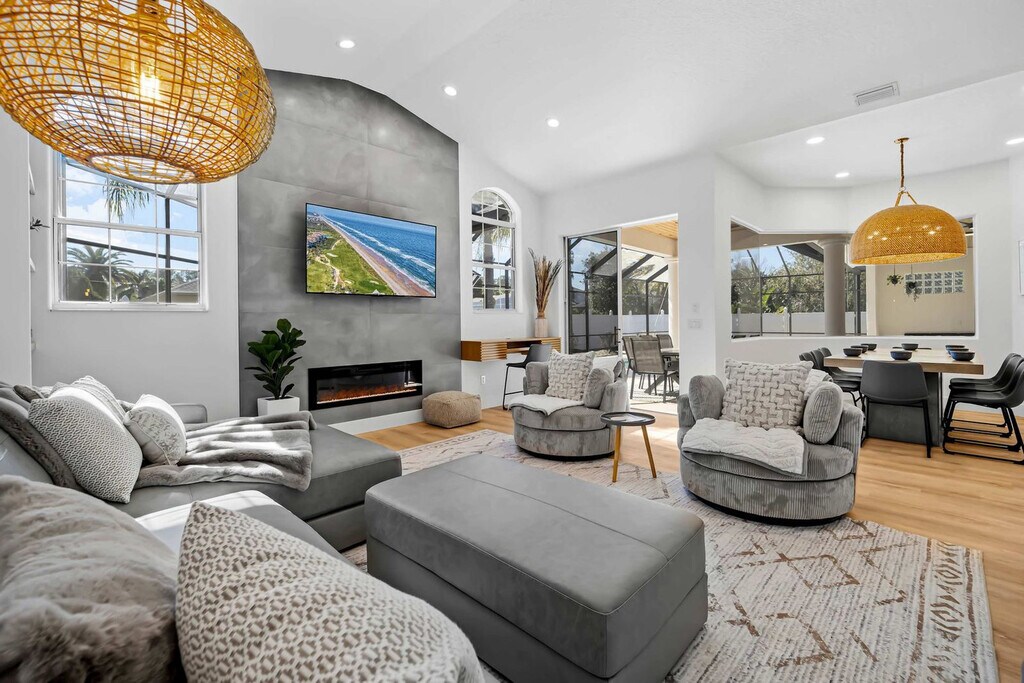 Step inside this stunning vacation retreat, a beautifully renovated 5-bedroom, 3-bathroom home. Luxurious finishes and thoughtful details create a welcoming atmosphere. Enjoy a large heated in-ground pool and separate heated spa, a cozy family room with a 75" Smart TV and electric fireplace, and a game room with pool, foosball, and tennis tables. The outdoor area features seating for 10, a fire pit, and a landscaped yard. Conveniently located near biking trails and stunning beaches, this home offers the perfect blend of comfort and adventure. Step into this beautifully renovated 5-bedroom, 3-bathroom retreat designed for ultimate comfort and relaxation. The home features a large, heated in-ground pool, a separate hot tub/spa, and an outdoor shower, making it perfect for soaking up the sun or unwinding after a day of adventure. Inside, the luxurious finishes and thoughtful details create a welcoming atmosphere. Three bedrooms feature plush king-size beds, while the remaining two offer cozy queen beds. All are adorned with high-end linens and towels for your comfort. The master suite is a haven of tranquility, complete with a spa-like bathroom featuring his-and-hers vanities and direct access to the outdoor spa for a truly indulgent experience. Pool and spa heating is available for $287 per week or $200 weekly for multiple week stays. Pets are welcome with a fee of $100 per pet per stay. If you plan to bring a trailer or RV, secure off-site parking is available approximately 7-10 miles from the property for $25 per day per unit. Just minutes from stunning beaches, this home is close to the historic charm of St. Augustine and a short drive to Daytona Beach and Orlando attractions. Located in the heart of Pine Lakes, the neighborhood is known for its beautiful tree-lined streets, serene lakes, and natural preserves. Pine Lakes is conveniently located just minutes from Palm Coast’s main thoroughfares, making it easy to access shopping, dining, and entertainment options. It's also a short drive to Flagler Beach, offering miles of pristine coastline. Quiet hours are between 22:00 and 8:00. This property is located in a residential neighborhood, so please be respectful to the neighbors and pick up after your pets. No trailers are allowed in the city of Palm Coast for more than 3 days. If you need to bring a trailer, please contact the host to make arrangements. A rental agreement must be signed to confirm your stay and receive check-in instructions. The home offers a remote work-friendly environment with Wi-Fi and multiple Smart TVs for entertainment. [SI]