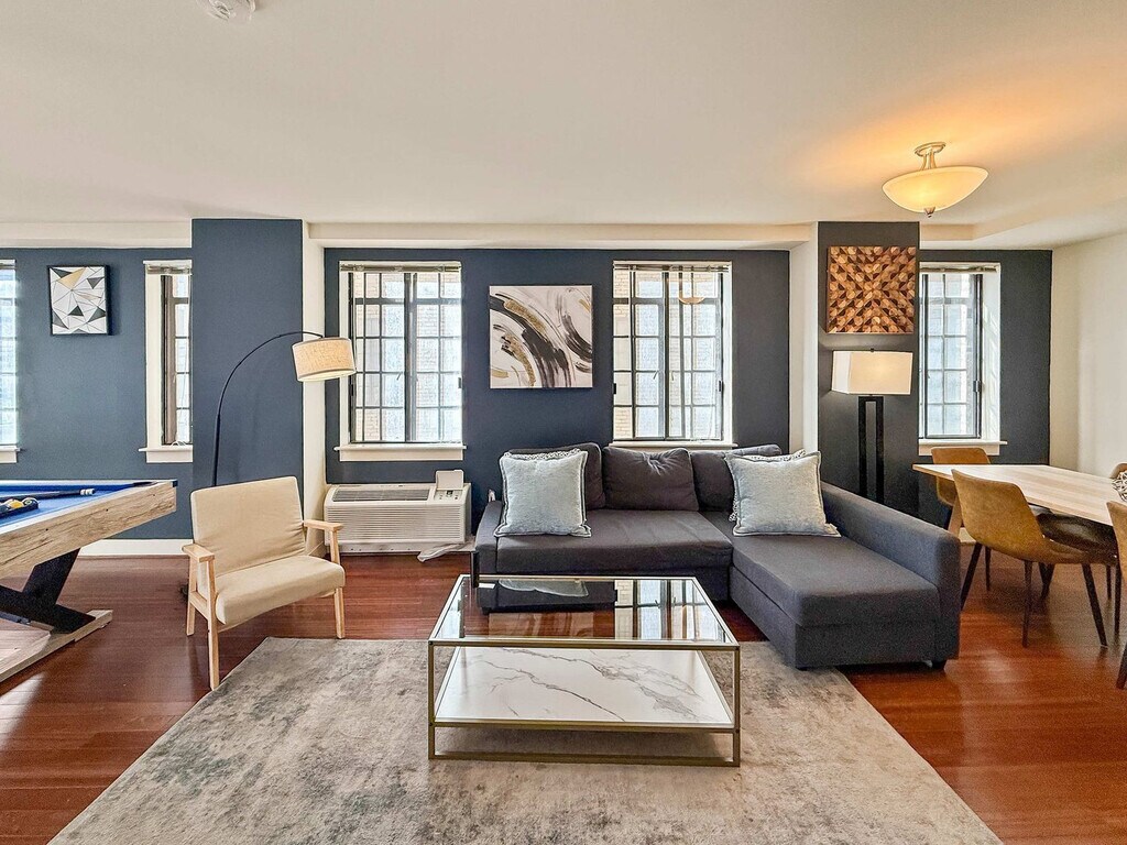 The advertised rate of $8,026/month is the lowest available price, based on a 30 day(s) stay with a move-in date of July 19, 2026. Rates vary depending on the duration of stay, season, and other parameters. For exact pricing and additional pricing components, please visit our website and enter your desired move-in and move-out dates. The rate is applicable when billed upfront; it can be higher if billed in multiple payments. Feel at home in this stylish 2-bedroom, 2-bathroom apartment in the heart of Philadelphia, steps from City Hall, Love Park, and Reading Terminal Market. Perfect for business or leisure travelers, it combines convenience, modern comfort, and easy access to Philadelphia’s iconic attractions, making your stay both enjoyable and memorable. This bright and spacious apartment features a fully equipped kitchen with modern appliances, cookware, and utensils, making it easy to prepare meals. The adjacent dining area is perfect for enjoying breakfast, dinner, or casual drinks together. The living room is inviting, with ample seating, a sofa bed for extra guests, and a pool table for fun after exploring the city. Both bathrooms are clean and well-maintained, and additional amenities like high-speed internet and laundry facilities make your stay convenient and stress-free. The first bedroom includes a cozy queen bed and a dedicated workspace, ideal for productivity or quiet relaxation. The second bedroom features two double beds and a crib, perfect for larger groups or families with young children. Located in the heart of downtown Philadelphia, this apartment puts you within walking distance of the city’s most iconic landmarks. Explore City Hall, snap photos at Love Park, and stroll through the vibrant Reading Terminal Market. Enjoy a variety of restaurants, cafes, and bars just steps away, or visit nearby museums, theaters, and shopping districts. The area is well-connected by public transportation, making it easy to explore other parts of the city. Getting around Philadelphia from this centrally located apartment is easy with public transportation options, including buses, subways, and trolleys, nearby for exploring other parts of the city. Ride-share services and taxis are also readily available. Quiet hours are from 10:00 PM to 8:00 AM; please keep noise to a minimum during these hours out of respect for neighbors. Smoking is strictly prohibited inside the apartment, and a $500 fine will be charged if there is evidence of smoking indoors. Pets are not permitted anywhere in the apartment or building. Check-out time is 10:00 AM; please ensure the apartment is vacated on time to allow the cleaning team to prepare for incoming guests. Registration Number: 545021 [SI]