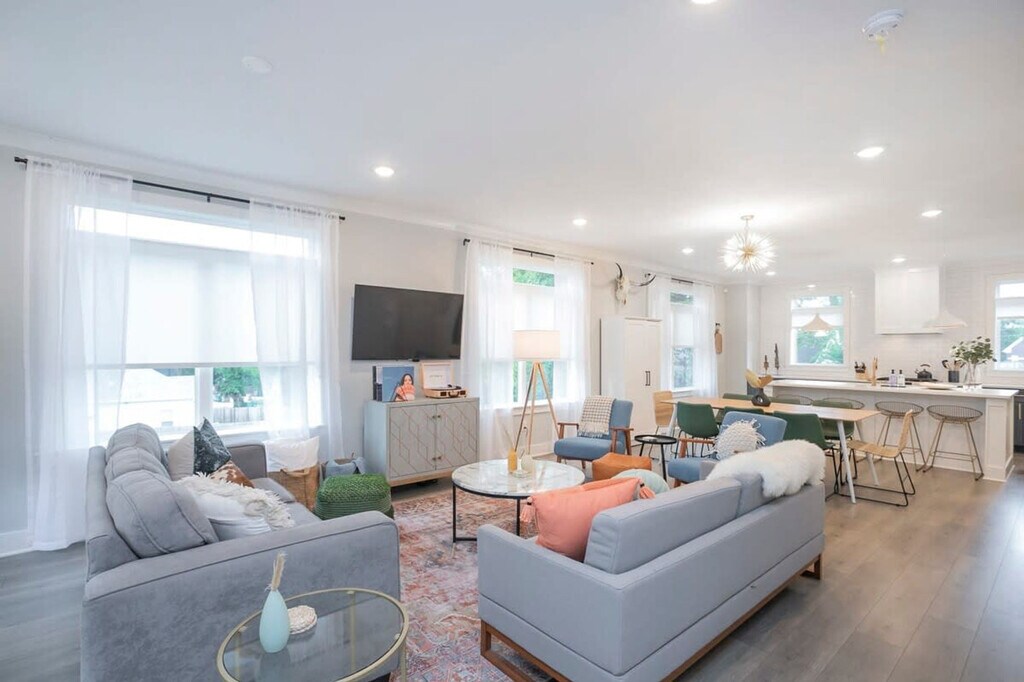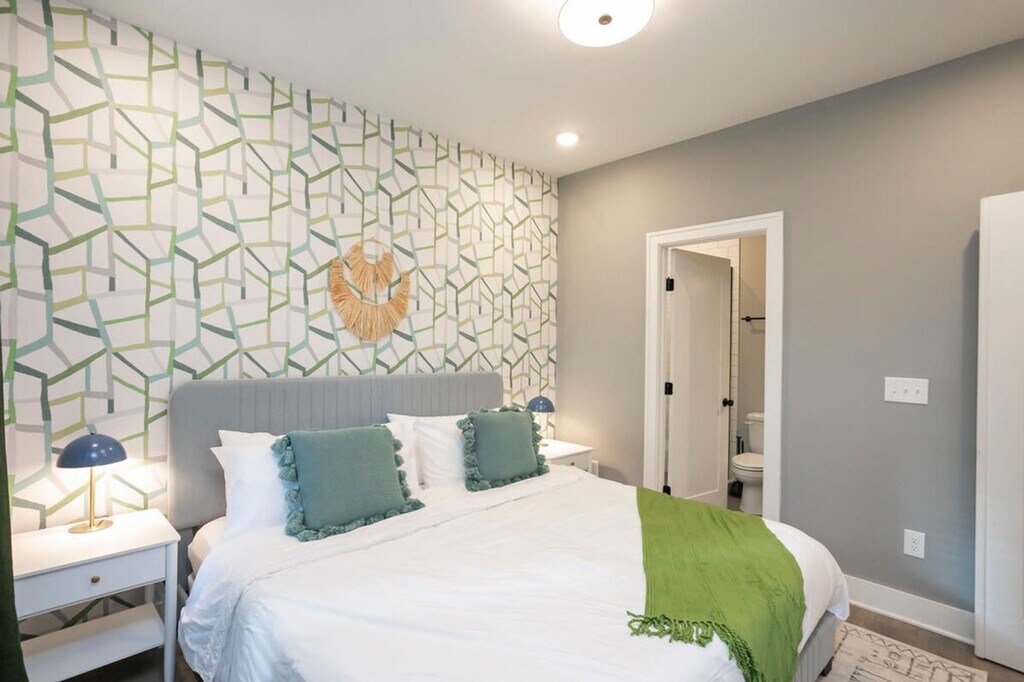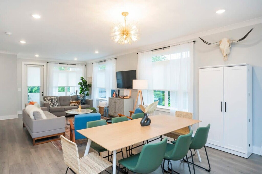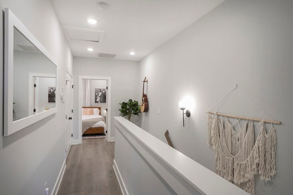 Escape to a Nashville oasis with this chic 2,000+ sq ft haven, just minutes from Broadway’s buzz. This apartment offers the perfect blend of comfort and style, featuring three luxurious bedrooms with ultra-comfy beds, accommodating up to ten guests. With 3.5 baths and a two-car garage, convenience is key. Located near Germantown, Top Golf, and Nissan Stadium, you’re always close to the action. The professionally decorated apartment spans multiple levels, providing ample bedding for large groups and families. It features an amazing balcony for supreme leisure and downtown viewing. The kitchen boasts all new appliances and is stocked with basic cooking supplies, dishes, and a coffee maker. The living room is comfy and modern with a flat-screen TV, making it perfect for your entire group to spend time together during your stay. Dogs are welcome with a limit of two under 50lbs. Dogs must be leashed when outside, and guests must pick up after their dog using the provided dog bag station. Dogs are not allowed on furniture or beds and should not be left unattended. If left alone, dogs need to be crated. Guests should use designated potty areas and ensure their dog doesn't cause excessive noise. This neighborhood is located a short distance from some of the hottest spots in East Nashville. If you are looking to get to know the real Nashville, and you want to do it in style, this is your place. Favorite spots nearby include Five Points, Butcher & Bee, The Pharmacy, Holland House, Barista Parlor, Edley's BBQ, Smith & Lentz Brewery, Southern Grist Brewery, and Mas Tacos. Getting around is easy with options like Lyft, Uber, scooters, walking, city transportation, and taxis. Construction is ongoing next door and around Nashville. The maximum guest count is strictly enforced with no unauthorized additional guests allowed. Exterior cameras monitor property entry, and violation consequences include immediate removal and a $500 fine. No decorations are allowed on walls, paint, or wallpaper. Early or late access requires advance approval, with optional guaranteed early or late access available at 50% of the nightly rate, subject to availability. No on-site luggage storage is available, but alternatives like Luggage Hero and Stow Station are recommended. Guests staying longer than three weeks will incur an additional cleaning fee. Only registered guests are allowed in the building or unit. The primary guest must be 21 years or older, and photo ID information must match the information on the credit card. While staying, ensure all doors are shut and locked when not in use, and do not leave valuables in your vehicle if parked on the street. A detailed digital guest book is provided with tips on how to work the TVs, trash, check-out instructions, and includes favorite spots in Nashville. Registration Number: