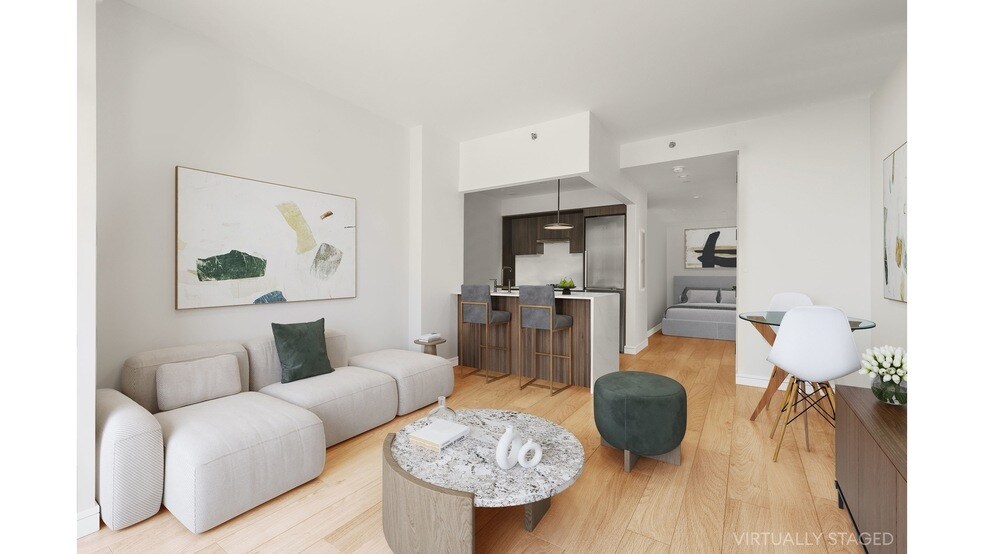 A towering 30-story sculpture rising over one of New York City's most rapidly evolving neighborhoods, 111 Varick offers 100 finely crafted rental apartments with unobstructed skyline and Hudson River views. These studio, one- and two-bedroom luxury homes, impeccably designed by S9 Architecture and Chris Shao Studios, are inspired by the industrial heritage of Hudson Square, bringing vibrancy to one of Downtown's most visible corners. 5D is a stunning southern facing alcove loft. The apartment features spacious closets, stainless steel Bosch appliances, insinkerator, Kohler fixtures, Calcutta gold quartz countertops, backsplash and custom crafted Italian cabinetry. Bathrooms include honed, diamond white cultured marble vanities; Casanova cabinetry; and Carrara marble flooring. Residences also come with Latch smart-lock apartment entry systems, Nest thermostats, Bosch washer and dryer, white oak flooring, 9-11 foot ceilings and solar shades. 111 Varick is Leed Silver Certified (pending) providing the utmost in energy efficiency and air quality. Each resident will enjoy the robust amenities and services package including a 24-hour doorman attended lobby, an expansive landscaped rooftop terrace with barbecue, open-air movie screening area, and unobstructed views across the Hudson River and dramatic vistas of Downtown and Midtown Manhattan. The building also boasts a fitness center, meditation room, conference room, club lounge with billiards table, media center, and children's playroom, and electric car charging stations. Disclosure of Fees: First Month's Rent: Payment for the first month of occupancy under the lease - Equal to one month's rent Security Deposit: Deposit held as security for performance of lease obligations - Equal to one month's rent Application Fee (per applicant): Fee for submitting rental application - $20/one time fee
