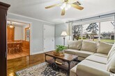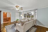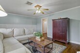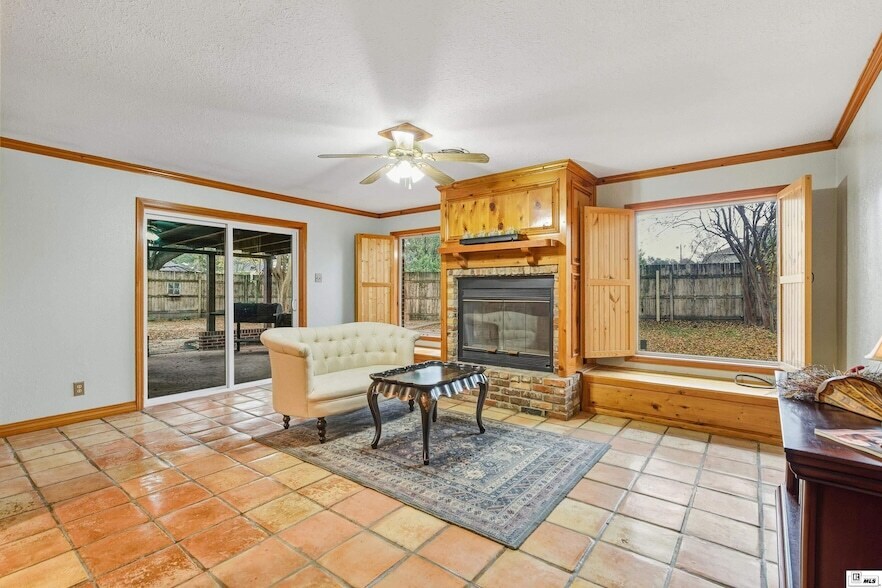 Welcome to this inviting home featuring multiple living areas, thoughtful updates, and great indoor outdoor flow. As you arrive, you ll notice the two-car carport and a small covered front porch. Step inside to the main living room, where hardwood floors and a large front window bring in plenty of natural light. To the right of the living room is the designated dining area, which opens to the kitchen. The kitchen offers abundant cabinetry, a built-in buffet, and a double-door pantry, along with convenient access to the carport. Just beyond the kitchen is a cozy den featuring a brick fireplace, wood shutters overlooking the fenced backyard, built-in bench seating, and a cypress-plank accent wall. A sliding glass door leads to the covered back porch with tile and brick flooring perfect for relaxing or entertaining. The den also includes a laundry room tucked just off the main space. From the living room, a hallway leads to two spacious bedrooms with continued hardwood flooring and a full bathroom featuring shiplap walls and a classic clawfoot tub. At the end of the hall is the primary bedroom, complete with an en suite bathroom showcasing tile flooring, shiplap walls, a tub/shower combo with gold accents, and modern charm. Outside, the property includes a built-in dog kennel area and a storage building, adding even more functionality to this well-loved home.