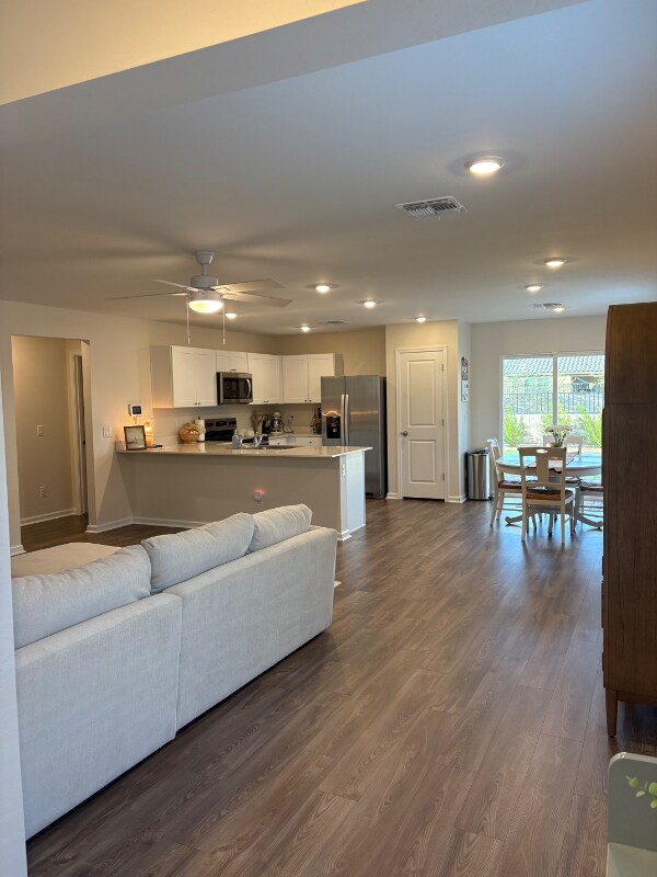 Property Id: 2189997 This home is a one year old home and has many amazing features! Freshly painted. It is spacious and has multiple upgrades and touches. The kitchen is open and perfect for entertaining with fresh cabinetry and newer appliances, and a long kitchen peninsula for serving or seating. There are ceiling fans in the primary bedroom and living room. The home has two sinks in the primary bath. Flooring in the home is carpet in the bedrooms, and then vinyl throughout the living, dining, bathroom and hall. The home has low maintenance landscaping in the front yard, with a few desert plants and trees. The backyard is perfect for entertaining- a small porch, custom paver extension to the backyard and then lush grass and bushes for privacy. There is a two car garage and driveway for parking. The home is on a corner lot so extra parking is available for guests along the west side of the home. The home is near two entrances (north or east) to the I-10 and only about a 30 minute drive to Chandler.