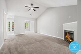 Welcome Home, this ranch one level condo has the perfect split bedroom layout! HVAC replaced July 2025! Fresh new paint, matte black lighting, carpet professionally cleaned, and ready to call home! Vaulted Living Room with corner Fireplace flows into the eat in Kitchen with White Cabinets, matte black hardware, and a glass french door leading to outdoor living! The Primary Suite is spacious and offers a generous en suite bath with Double Sink Vanity, New Lighting, Soaking Tub, Separate Walkin Shower, & Walk in Closet! Bedroom 2 is filled with natural light and has direct bath access! There's a Flex Space or Home Office area at the front with tons of possible uses! 1 Car Garage. Truly maintenance free living and so closet to RDU, Brier Creek Shopping, Grocery and more. Community Pool, Tennis, Putting Green, Gym, Play Area, Clubhouse.
