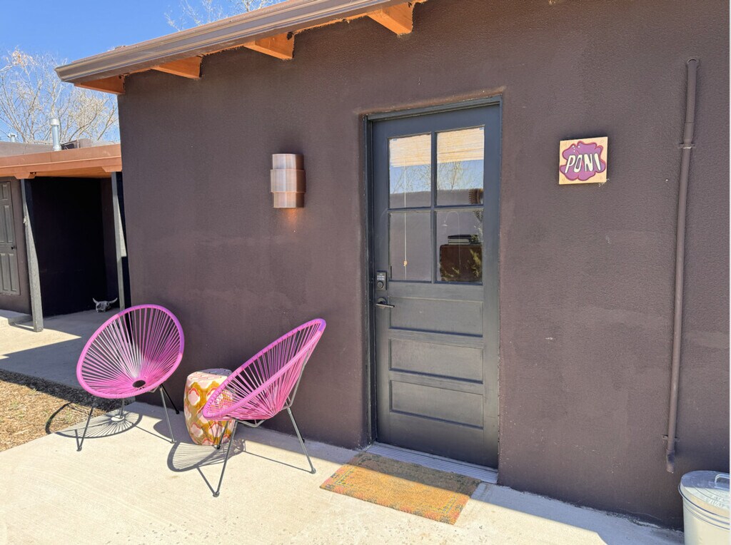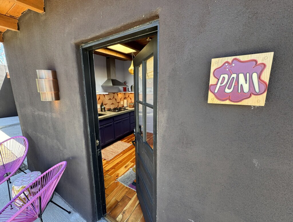 Feel at home in the Poni Suite, designed with your comfort and coziness in mind. This casita is part of a collection of 7, built using upcycled vintage furniture and custom craft from local artisans. Every nook of this place, from the zellige tile in the bathroom to the corner fireplace in the bedroom, has been designed with your comfort in mind. The bed is outfitted with Brooklinen sheets and a Purple mattress. A car is recommended. It is possible to get around by bike in the warmer months, and the Santa Fe Trails bus system does have a route that passes on Agua Fria street. Ubers and Lyfts are also available. Located on Agua Fria Street, once part of the Camino Real de Tierra Adentro that connected Santa Fe to Mexico City, this apartment has been continuously settled for thousands of years and sits at the foot of the Sangre de Cristo Mountains. Today, it is in a bustling commercial and light industrial area less than a mile from attractions like Meow Wolf, 10 minutes from Downtown and The Plaza, and near many exciting new restaurants, microbreweries and coffee shops. The back of the property looks out on the Santa Fe River, a normally dry arroyo that runs all the way to the mountains, with the Santa Fe River Trail, a walking and biking path that goes through the whole city. Quiet hours are after 10pm. Registration Number: STR233537 [SI]