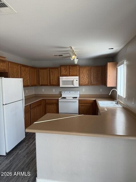 Lovely home 4 beds, 2. baths. Cathedral ceilings for an open feel and the Master Suite is downstairs. Terrificly designed kitchen adjacent to the dining and great rooms for easy entertaining. Another great feature is there is a powder room downstairs, as well as, a sink in the garage which works well for future tenants. The easily maintained desert front & back features mature trees that provide lots of shade which is another great feature for any future tenant. NO CATS. Pet rent on a sliding scale based on dog. A no-deposit option is available O.A.C., with a 10% monthly fee that can be removed once the deposit is paid. All residents enrolled on Resident Benefits Package, including HVAC filter delivery and credit-building to help boost your credit score with timely rent payments.