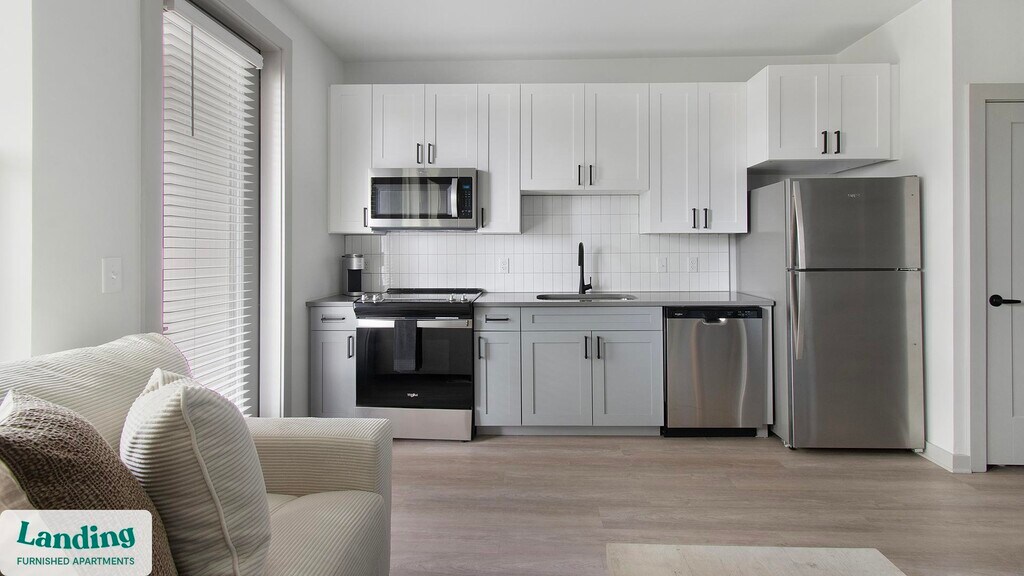 Landing offers flexible lease terms from weeks to months. Please always visit our website or contact us for the latest pricing & availability. Stay longer, save more: 6-Month Minimum base rent: starts at $2089/mo 12-Month Minimum base rent: starts at $1656/mo Landing offers flexible leases across a network of over 35,000 fully-furnished apartments throughout 375+ cities so you can rent on your terms, practically anywhere, and avoid the hassle of paying deposits or application fees. Visit to learn about all the benefits of a Landing membership, see our competitive up-to-date pricing, explore available apartments, take virtual tours, and make reservations online without jumping through traditional rental hoops. Landing's apartments at Corner on Main are designed for comfortable, easy living, with the ability to stay as long as you like. Experience living with Landing Every apartment is outfitted with all the modern essentials including: custom-designed furnishings, a fully-equipped kitchen with deluxe stainless steel appliances, a gourmet coffee maker, premium linens, Smart TVs, and incredibly fast, reliable internet for working from home. When you live with Landing, you'll enjoy a hassle-free experience with the added benefit of 24/7 access to our dedicated member experience team. Some of the nitty-gritty: a background check and proof of income are required; we're completely smoke-free; bundled utility packages and pricing vary based on length of stay; pet-friendly options available; listed price reflects a 12-month minimum stay.