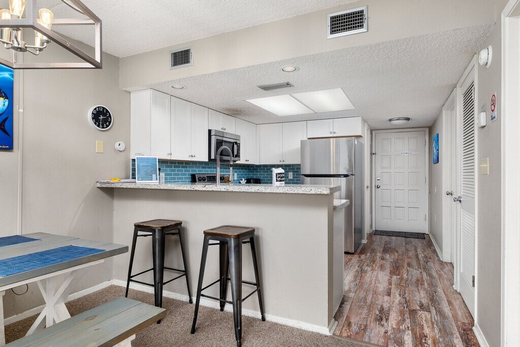 The advertised rate of $2,619/month is the lowest available price, based on a 1 month(s) stay with a move-in date of April 13, 2026. Rates vary depending on the duration of stay, season, and other parameters. For exact pricing and additional pricing components, please visit our website and enter your desired move-in and move-out dates. The rate is applicable when billed upfront; it can be higher if billed in multiple payments. Feel at home in this island-inspired condo, just steps from South Padre Island’s beaches. This condo sleeps 6 and is perfect for families or small groups seeking a beach getaway. The living area features island-inspired decor, comfy seating, and a smart TV, with access to a private balcony. The open-plan, fully equipped kitchen includes counter seating and a dining table, perfect for meals or casual gatherings. The condo also includes adjustable heating and cooling and an iron and ironing board. Enjoy access to a shared resort pool and hot tub. Optional mid-stay cleaning is available upon request for an additional fee. This condo is ideally located steps away from South Padre Island beaches, 0.9 miles from Isla Blanca Park, 1.2 miles from local surf spots, 1.6 miles from Laguna Madre Nature Trail, and 1.9 miles from local seafood restaurants and sunset spots. Walking is ideal for nearby beach access. Port Isabel is 6.2 miles away, and Valley International Airport is 28.6 miles away. Quiet hours are between 11 PM and 8 AM. Parties, events, and smoking/vaping are prohibited in or around the property, and if any of these house rules are broken, you and your group may be subject to additional charges or be requested to vacate the property immediately without refund. Late departures will result in a charge for each additional hour the property cannot be accessed for turnover. Outside of service animals, pets are not permitted at this property. Firearms and weapons are strictly prohibited on the property. The reservation must be made by someone who is at least 21 years of age. All guests may be required to complete ID verification before arrival, and check-in instructions will be shared once verification is completed. [SI]