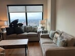 Fully furnished High-rise Luxury condo in the brand new Novus Building ( in the heart of Downtown Durham! Resort living in downtown Durham, opposite to the Google building. One Bedroom, full bath, Living room and a gorgeous kitchen with High-end Wolf appliances. All appliances - Washer, Dryer & Refrigerator included. Open concept space and full length glass maximize the spectacular views. Waterfall edge countertop, integrated cabinet front appliances, and large patio-high end finishes throughout create an air of sophistication. Amenities in the building includes a huge swimming pool (on the 7th floor), hot tub, pickleball court, gym, club room, dog park, outdoor theater, and golf simulator among other wonderful features. This unit comes with one dedicated parking spot with an installed car charger.