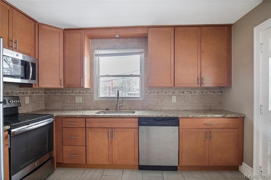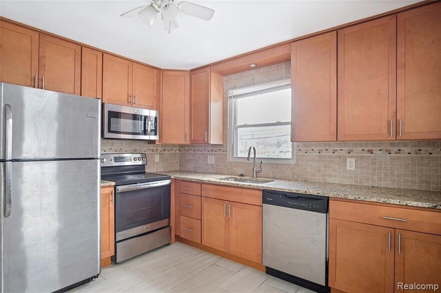 Nicely updated 2BR in Royal Oak! Modern kitchen with shaker cabinets, granite counters, stainless appliances & mosaic tile backsplash. Gleaming hardwood floors, updated full bath with contemporary tile work, generous closets. Private entrance via rear deck. On-site laundry & parking lot included. Window AC units stay. Fresh neutral palette throughout. Prime location near downtown Royal Oak's restaurants, bars & boutiques. Well-maintained building, practical layout. Great value for walkable urban living.