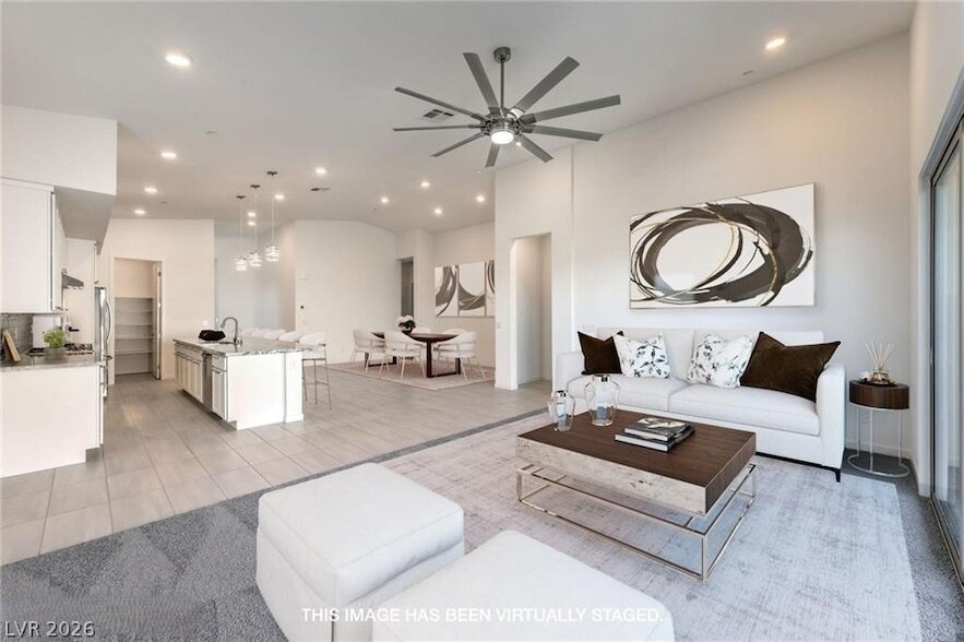 Summerlin Luxury Single-Story Rental | 4BR Corner Lot in Gated Savannah at Redpoint. This stunning single-story residence offers 4 bedrooms, 3 full baths, and a 3-car garage. Inviting front courtyard with Strip views welcomes you inside to vaulted ceilings, porcelain tile flooring, and a bright open floor plan. The gourmet chef s kitchen features white shaker cabinets, glass tile backsplash, Viscount White granite island, farmhouse sink, pendant lighting, stainless steel appliances, and a large walk-in pantry. Spacious living room and owner s suite include oversized designer ceiling fans and privacy blinds. The private primary suite offers a spa-like bath and large walk-in closet. Enjoy seamless indoor-outdoor living with a 12-ft disappearing sliding glass door opening to a covered paver patio, turf yard, and BBQ stub. Tankless water heater and fiber internet available. Steps away from beautiful walking trails, minutes to Downtown Summerlin, Red Rock Casino, parks, shopping, & dining.