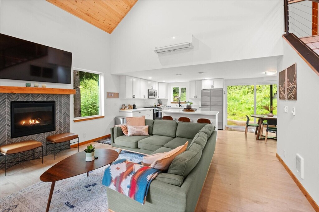 Experience the tranquility of the countryside in this new 3-bedroom, 2-bathroom home, just 8 minutes from Mt. Rainier National Park. This two-level retreat, spanning 1,488 sqft, offers a few steps to the entrance door, making it your ideal escape. Feel at home in this spacious retreat featuring a backyard equipped with a BBQ grill, fire pit, and hot tub, perfect for relaxing after a day of adventure. The home boasts a fully stocked kitchen with a coffee maker, dinnerware, silverware, drinkware, cookware, and servingware. Enjoy the versatile and spacious loft with a sofa bed, on-site washer and dryer, mini-split for cooling, and a fireplace for cozy evenings. Smart TV and internet are available for streaming, and the front porch and covered backyard deck offer year-round outdoor relaxation. The regular nightly rate covers 6 guests, with additional guest fees of $25 per person per night, up to a maximum of 8 guests. Well-trained pets are welcome with a fee of $50 per pet. Please inform us if you’ll be bringing your pet and how many. The pet fee beyond one pet is processed manually post reservation confirmation. Located in Paradise Estates, a private community about 5 miles from the Nisqually entrance of Mt. Rainier National Park, this home offers access to excellent hiking trails and diverse outdoor activities. The cabin is accessed by fully maintained roads all year round, but there is no public transit nearby, so it is only accessible by car. Four-wheel drive is recommended in the winter, and tire chains are available for rent at local stores during winter. This pet-friendly home requests that pets are not allowed on furniture or linens, including couches, throws, beds, pillows, and towels. Pets should not be left unattended, and guests are asked to bring poop bags and pick up after their pets. Strictly no parties or events are allowed, with quiet hours between 10pm-8am. No smoking or vaping of any kind is permitted anywhere on the property, including outdoor areas, and there is a $500 fine per violation. Use of the fire pit and charcoal grill is prohibited during the burn ban. [SI]