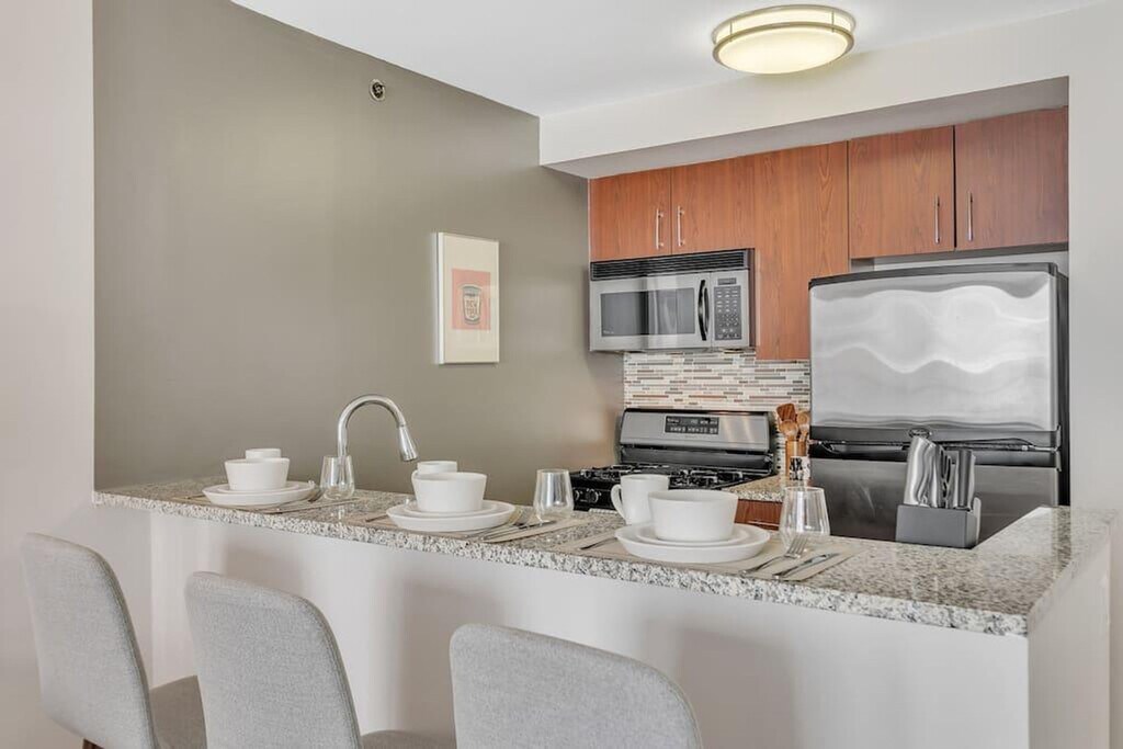 Feel at home in this spacious 1-bedroom apartment in the heart of Manhattan's historic Chelsea district, nestled on a quiet block between 6th and 7th Avenues. The building has elevators and a 24-hr door attendant. This fully furnished apartment is specifically designed for remote work and features a queen-size mattress, a full bathroom, and a fully equipped kitchen with stainless steel appliances (including dishwasher) and a breakfast bar. Amenities include hardwood flooring, spacious closets, laundry onsite, a fitness center, a community lounge, and a rooftop sundeck with city views, a TV, and a BBQ. The kitchen is stocked with a Keurig coffee machine and pods. Professionally managed parking is available onsite (not included). You'll be steps from world-class shopping, dining, and entertainment, and within walking distance of famous sites such as The Highline, Madison Square Garden, The Whitney Museum, and Broadway. This unit is located near a busy street, and traffic noise may be significant. The building is currently undergoing renovation and is expected to continue until January 2026. Internet speeds are not guaranteed and may fluctuate based on your computer model and the router location. Includes private high-speed internet, an Uplift standing desk, an Uplift work chair, a 34-inch ultra-wide Samsung monitor, a Blue Yeti microphone, a Logitech webcam, Logitech computer speakers, a key light, a monitor light, a green screen, a Logitech keyboard, a Logitech mouse, a laptop stand, and a TOTU 16-in-1 Triple Display USB-C 3.1 Docking Station. A laptop computer is not included. [SI]
