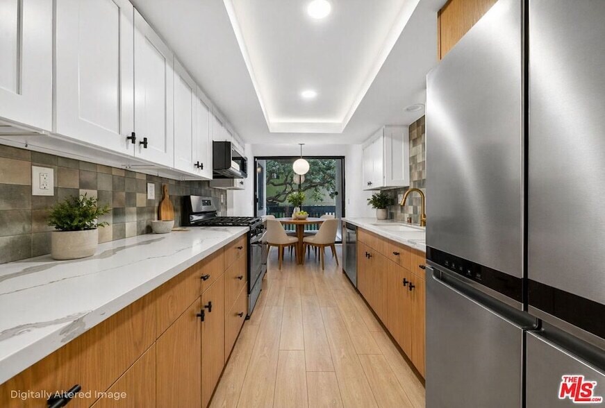 Welcome to a beautifully remodeled, light-filled condo in the heart of Studio City. This spacious 2-bedroom, 2-bathroom residence spans 1,325 sqft and features a thoughtfully designed single-level open floor plan, perfect for both everyday living and effortless entertaining. The chef-inspired kitchen is equipped with sleek stainless steel appliances, quartz countertops, and generous prep space, ideal for cooking for one or hosting family and friends. The expansive living and dining areas flow naturally to a private balcony, offering a peaceful treetop setting for morning coffee or evening unwinding. Retreat to the oversized primary suite, complete with a walk-in closet and a beautifully appointed ensuite bath. The second bedroom offers flexibility for guests, a home office, or creative space. Additional highlights include brand new HVAC, in-unit laundry, and abundant natural light throughout. Enjoy the convenience of two tandem garage parking spaces with a private storage shed, plus access to a sparkling community pool & spa. Ideally located just one block from Ventura Blvd, you're walking distance from Trader Joe's, the Studio City Farmers Market, top dining, cafes, and local hotspots. This is elevated living in one of LA's most sought-after communities.