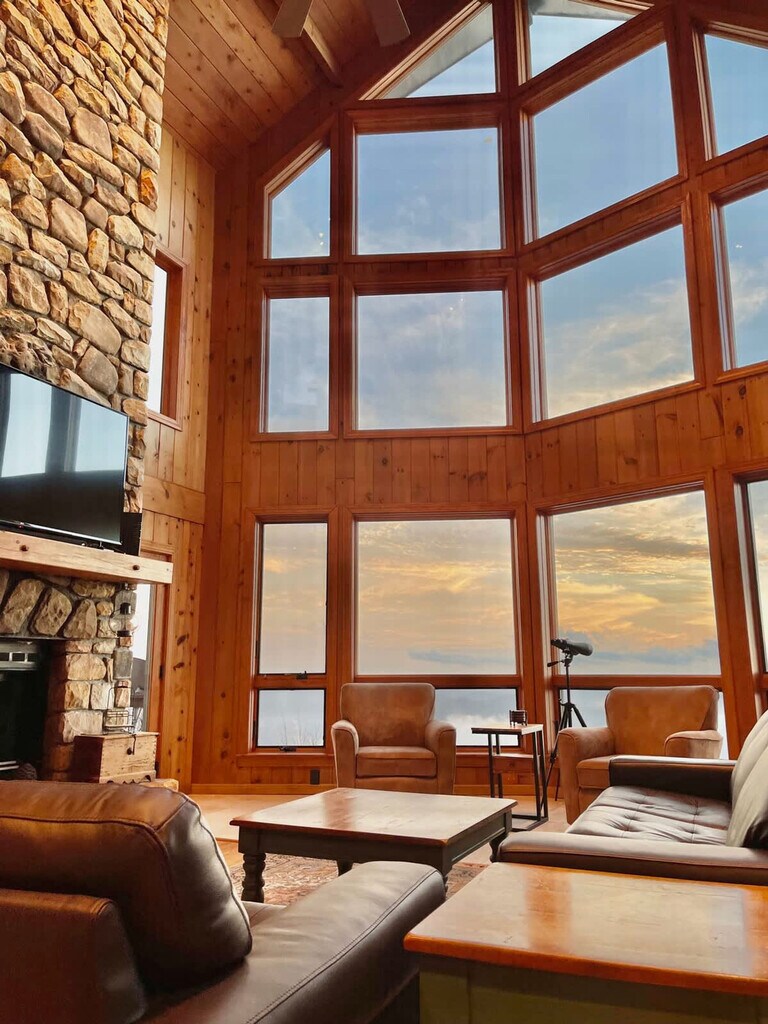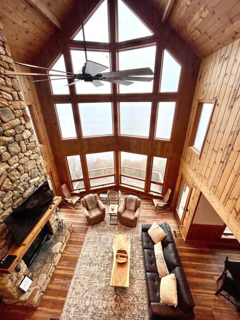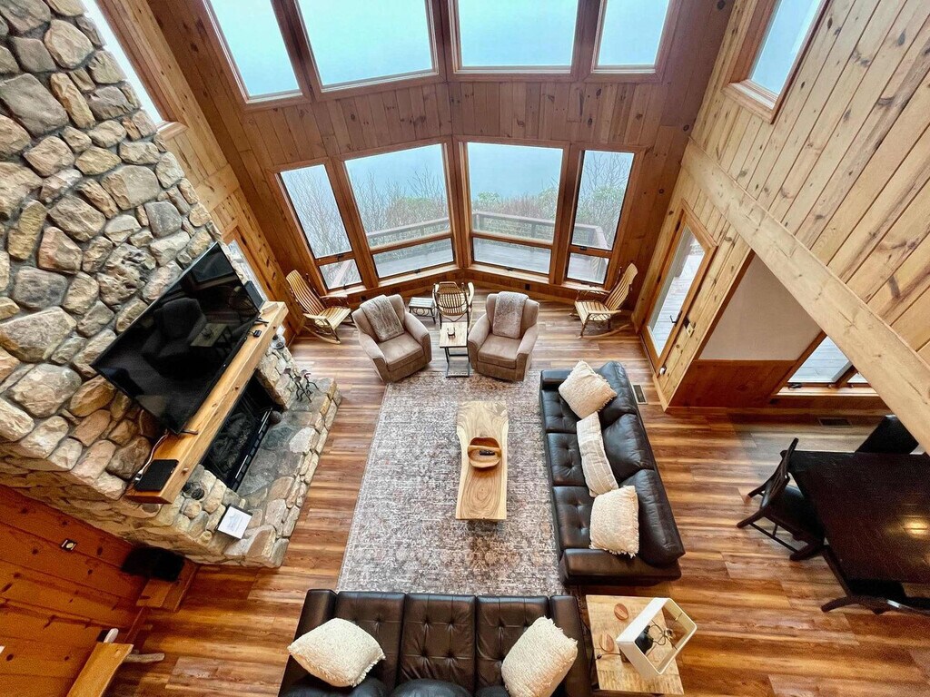 Experience unmatched views and comfort at Oz Cathedral, a stunning mountaintop chalet perched at an impressive 5,345 feet on Beech Mountain. This expansive 5-bedroom and 3.5-bath residence features vaulted ceilings, a gourmet kitchen with granite counters and stainless appliances, and a cozy living area with a fireplace. Feel at home as you take in breathtaking 180-degree views of three states from the two-tiered deck with a raised fireplace and gas grill. Welcome to a remarkable retreat where luxury meets nature. Upon entering, you will be captivated by the massive 2-and-half-story vaulted ceilings and floor-to-ceiling windows that frame the spectacular mountain landscape. The main floor boasts a spacious living area with double sofas, a dining area with seating for 10+, and a gourmet kitchen with solid wood cabinetry and a gas stove. The master bedroom offers a queen bed, fireplace, and full stone bath with a soaking tub. Upstairs, find four additional bedrooms with queen beds and a loft den with entertainment options. The downstairs area includes a future game room with bumper pool and foosball, and a warm garage entry for easy access to snow gear. Early check-in and late check-out are subject to availability with a $25 per hour fee. Parking is limited to no more than 3 cars, and street parking is not permitted. Firewood is not provided, but can be purchased in town. The chalet is situated in the small vacation town of Beech Mountain, NC, offering a wonderful ambiance and a place to relax and refresh. The serene setting provides plenty of attractions such as skiing, snowboarding, eco-tourism, and hiking. Both Beech Mountain and Banner Elk offer fine dining and shopping at your fingertips. It is highly recommended to bring a 4WD or AWD to access Beech Mountain, especially during winter months when snow chains are suggested. Security cameras are located on the front door, back deck, and garage. Quiet hours are after 10 PM, and trash must be bagged and taken to the Bearicade to avoid a $50 charge. Smoking is not allowed, and supervision is required for small children on the decks due to extreme height and sudden drop-off. A rental agreement is required to be signed per North Carolina Chapter 42A Vacation Rental Act.