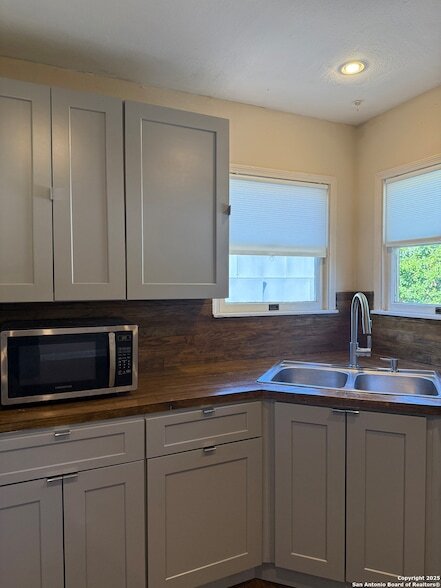 One bedroom four-flex apartment in Alamo Heights for lease. Upstairs, central air, hardwood floors, gas cooking, chopping block counters, abundant natural light. Shared washer/dryer. One car garage available