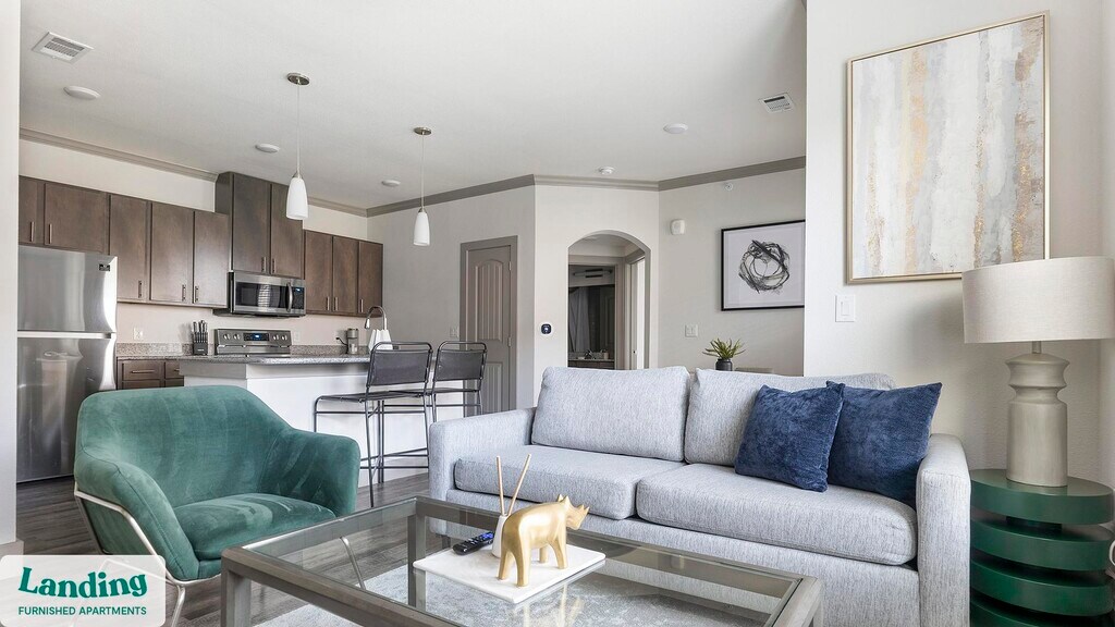 Landing offers flexible lease terms from weeks to months. Please always visit our website or contact us for the latest pricing & availability. Stay longer, save more: 6-Month Minimum base rent: starts at $1654/mo 12-Month Minimum base rent: starts at $1571/mo Landing offers flexible leases across a network of over 35,000 fully-furnished apartments throughout 375+ cities so you can rent on your terms, practically anywhere, and avoid the hassle of paying deposits or application fees. Visit to learn about all the benefits of a Landing membership, see our competitive up-to-date pricing, explore available apartments, take virtual tours, and make reservations online without jumping through traditional rental hoops. Landing's apartments at The Flats at Shadowglen are designed for comfortable, easy living, with the ability to stay as long as you like. Experience living with Landing Every apartment is outfitted with all the modern essentials including: custom-designed furnishings, a fully-equipped kitchen with deluxe stainless steel appliances, a gourmet coffee maker, premium linens, Smart TVs, and incredibly fast, reliable internet for working from home. When you live with Landing, you'll enjoy a hassle-free experience with the added benefit of 24/7 access to our dedicated member experience team. Some of the nitty-gritty: a background check and proof of income are required; we're completely smoke-free; bundled utility packages and pricing vary based on length of stay; pet-friendly options available; listed price reflects a 12-month minimum stay.