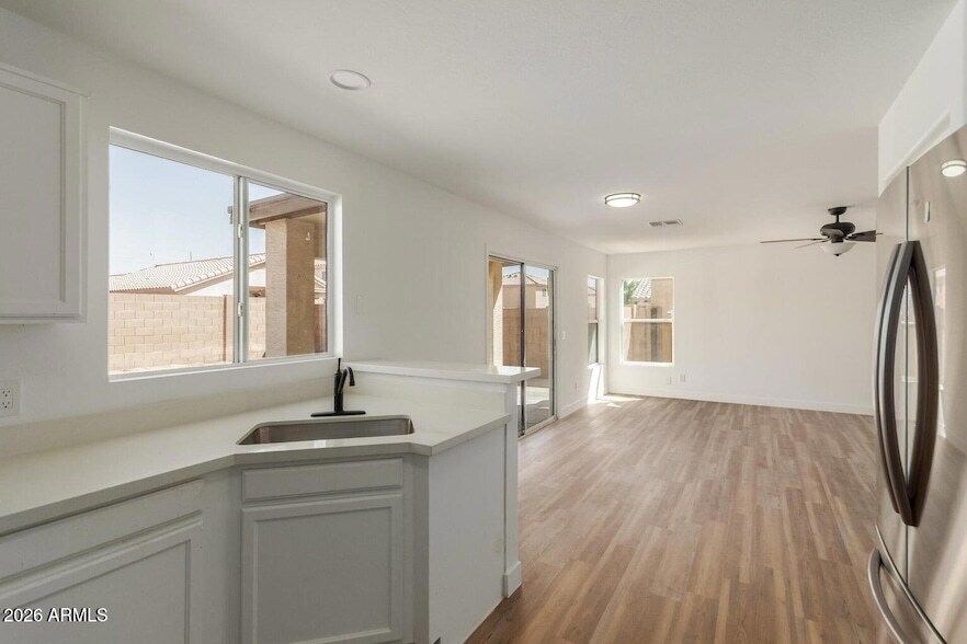 4-bedroom, 2 Baths, 1,832 sq ft, a 2-car garage, and a flexible upstairs loft ideal for a media room. Located in Sundial 3 Unit 3 near schools and parks within Dysart Unified, this home features a bright open floor plan with wood-look vinyl flooring and sliding doors that connect the main living area to the backyard. The eat-in kitchen includes stainless steel appliances, wood cabinetry, quartz countertops, a pantry, and an easy flow into the dining and great room setup. Upstairs, the massive loft adds extra breathing room, while the primary suite delivers a walk-in closet and an ensuite with dual vanities and a fully tiled shower. You will also appreciate upstairs laundry with washer hookup and gas dryer hookup. Outdoor has a nice covered patio and low maintenance front yard landscaping.