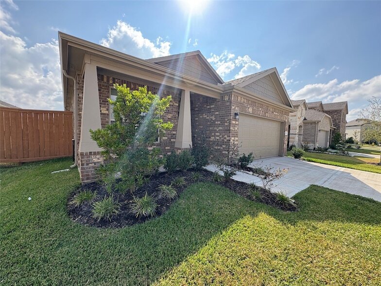 Charming single-story home in the Sunterra community. This 3-bedroom, 2-bathroom residence offers 1,500 sq. ft. of living space. Features include a spacious open-concept living area, modern kitchen with granite countertops, and a dedicated study. The primary suite boasts a walk-in closet and en-suite bathroom. Additional highlights are the attached 2-car garage, landscaped front yard, and covered patio. Built in 2023, this home combines contemporary design with functional living spaces.