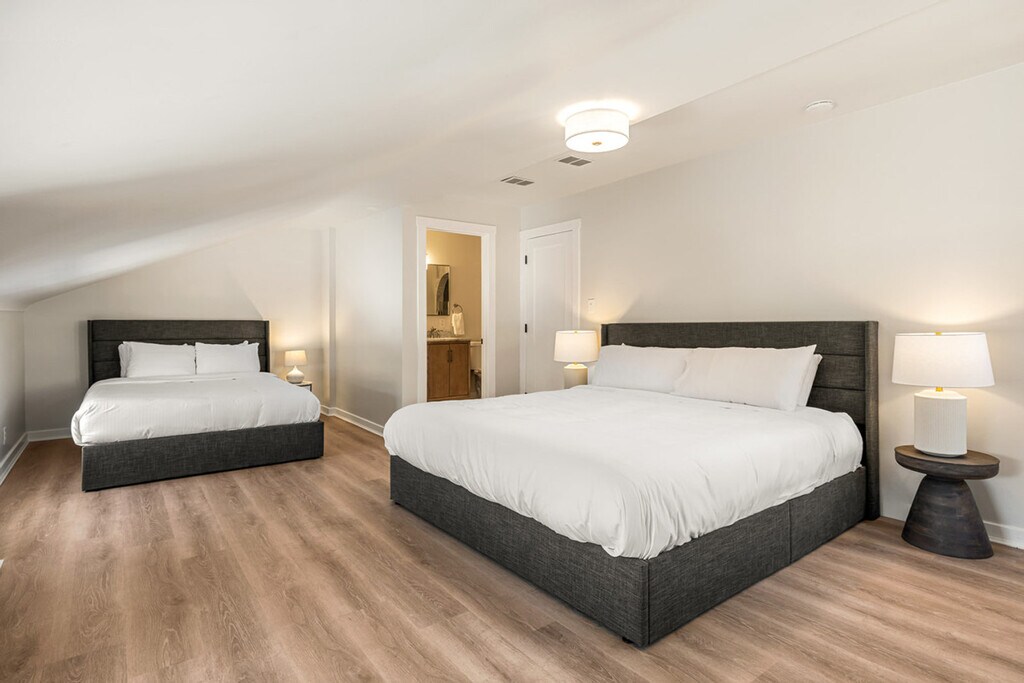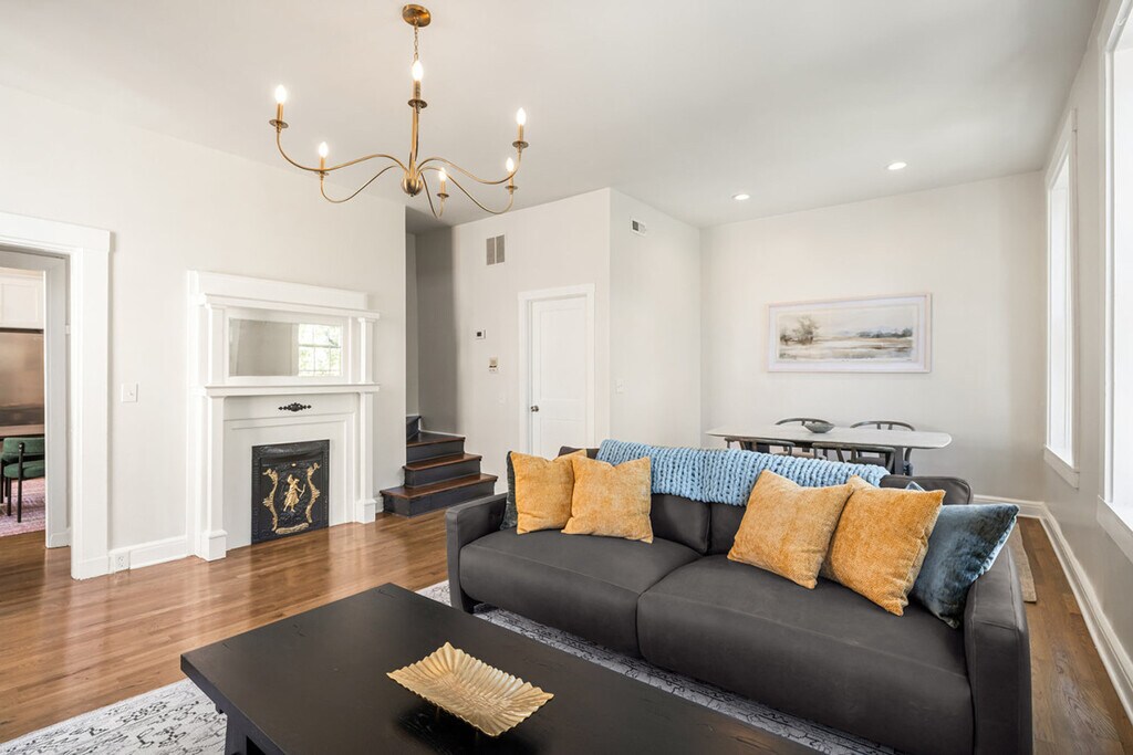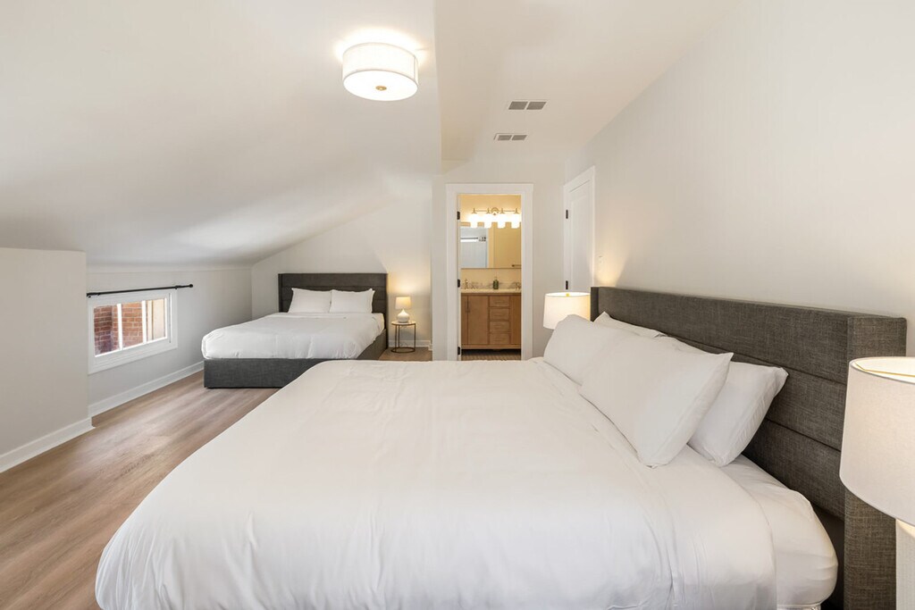 Experience luxury in this stunning condo located on one of the nicest streets downtown, directly across from Ziegler Park, with breathtaking views. Situated on the third floor, this property features high-end furnishings from Arhaus, offering a bright and spacious environment perfect for visiting executives, families, and wedding groups. You're just steps away from the best food and entertainment Cincinnati has to offer, making this location unbeatable. Upon entering, you'll be greeted by a gorgeous kitchen with a marble backsplash and a high-end Arhaus dining table. The living room boasts a comfortable leather sofa, another dining table, a half-bath, and a large-screen TV, with views of the tree-lined street, Ziegler Park, and Music Hall. Upstairs, you'll find two more bedrooms and two bathrooms, including a palatial master bathroom with polished nickel fixtures and a marble shower designed for two. We provide a parking pass for one vehicle in Ziegler Garage, a short three-minute walk away. Additional vehicles can park in the same garage for approximately $10 per night. Enjoy access to a huge rooftop deck overlooking the city and free in-unit washer/dryer. Nestled in the historic Pendleton area of Cincinnati's vibrant Over-The-Rhine, this condo offers a 94 walk score, making it a walker's paradise. You're within walking distance of hundreds of cafes, restaurants, boutiques, bars, and more. The location is also convenient for exploring top attractions, with a free streetcar stop nearby to get around downtown, and just minutes away from UC Health, Cincinnati Children's, and Christ Hospital. The unit is located on the third floor, requiring two short flights of steps to enter, with bedrooms up another flight of steps. Quiet hours are from 9:30pm to 8am, and amplified music is forbidden without advance written consent. Smoking or lighting anything indoors is prohibited, with a $300 cleaning fee for violations. Parties are strictly forbidden, and unauthorized parties may result in prosecution under Ohio Revised Code and Cincinnati municipal code. Violating house rules may result in reservation termination without refund. A $170 re-keying fee applies for unreturned keys. [SI]