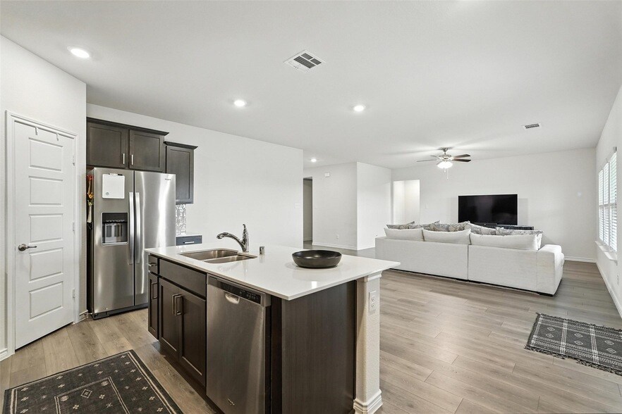 This charming 3-bedroom, 2-bath home is situated on a 0.249-acre lot that backs up to a greenbelt, offering stunning views of sunrises and sunsets from front covered porch and covered back patio. The interior boasts spacious living and dining areas that flow seamlessly into the bright and airy kitchen, which features a gas range, a large island, and a walk-in pantry. The oversized utility room provides ample space for a full-size washer, dryer, and even a freezer. This property stands out with its full gutter system and extended fence; unique features not found in other homes in the neighborhood.