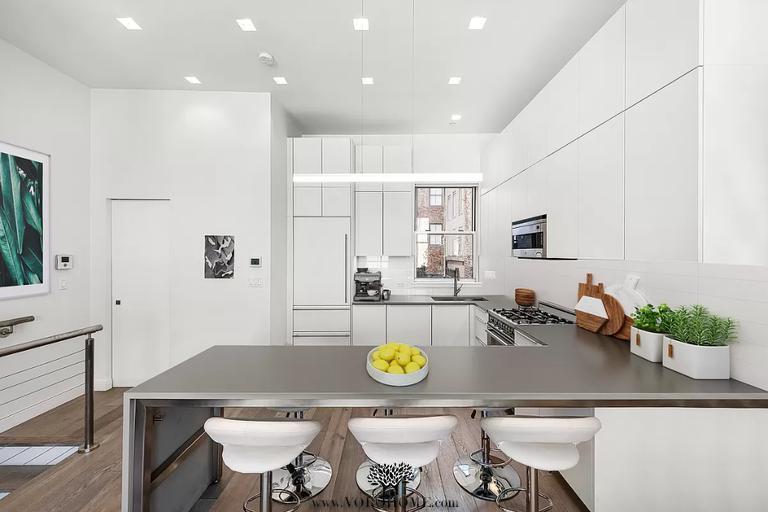 Located in the Historic South Street Seaport District, this four story townhouse has been fully renovated and features a landscaped rooftop terrace, a private garage, and comes with approved landmark plans for a penthouse addition! The entertaining floor of this home includes a generous living room illuminated by a trio of large south facing windows. The open kitchen is complete with a suite of integrated appliances by Liebherr, Miele, and Bertozzoni and is finished with sleek white Poggenpohl cabinetry. A beautiful peninsula with waterfall countertop creates an elegant separation of the distinct areas, and a contemporary powder room is easily accessible. The next floor includes two well-proportioned bedrooms, each with bright natural light and a reach in closet. A full bathroom serves these two rooms. The master bedroom is on its own floor, and the master bathroom includes dual sinks, a splendid rain shower with skylight, and a massive walk in closet. This nearly 19' wide home has its own garage with laundry area and is complete with a landscaped rooftop terrace overlooking charming cobblestone streets. 136 Beekman offers the privacy of townhouse living paired with the luxury of being located near great dining, shopping, and entertainment options including restaurants by Jean-Georges and Momofuku, the iPic theater, and Pier 17's outdoor concert venue. *Some images are virtually staged.