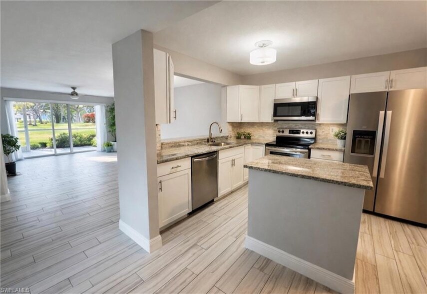 Fully remodeled first-floor corner condo in Canterbury Village featuring 3 bedrooms and 2 bathrooms. This move-in-ready unit offers tile flooring throughout, an updated kitchen with granite countertops and stainless steel appliances, and renovated bathrooms. Enjoy the open living and dining space and relax on the screened lanai with southeastern exposure, just steps from the community pool. Conveniently located near Berkshire Commons shopping and dining, approximately 15 minutes from beaches and downtown Naples, and close to Golden Gate Community Park with an aquatic complex, fitness center, and sports courts.