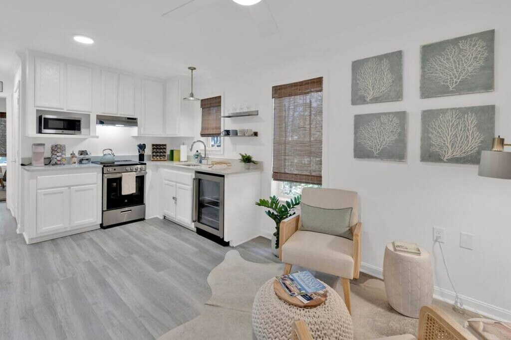 The advertised rate of $3,987/month is the lowest available price, based on a 30 day(s) stay with a move-in date of August 16, 2026. Rates vary depending on the duration of stay, season, and other parameters. For exact pricing and additional pricing components, please visit our website and enter your desired move-in and move-out dates. The rate is applicable when billed upfront; it can be higher if billed in multiple payments. Escape to this charming and cozy 1-bedroom, 1-bathroom cottage in the heart of Grayton Beach, Florida, just steps away from the world-famous 30A and Seaside. Nestled in the trees and surrounded by shops and restaurants, feel at home in this peaceful and serene vacation retreat. This recently renovated cottage features a fully equipped kitchen with all the essential appliances, utensils, and basic cooking supplies. Enjoy meals at the cozy table for two, or relax in the small seating area while watching favorite shows on the 50-inch smart TV with Direct TV. The memory foam queen-size bed and built-in dresser drawers will ensure a good night's sleep. The bathroom is equipped with all the essentials, including a shower/tub, shampoo, conditioner, body wash, and blow dryer. A washer and dryer are also provided for convenience. Guests can take advantage of Seaside's free shuttle service, which has a convenient pick-up location just across from the Shops of Grayton parking lot, practically next door to the cottage. The shuttle is a great option for avoiding traffic on Scenic Hwy 30A and operates from 6 a.m. to midnight with wait times usually no more than 10 minutes. The buses are air-conditioned and heated for comfort, and as the shuttle travels along Scenic 30A, guests will enjoy stunning views of the Western Lake bridges and the Timpochee Trail. Located just minutes from the famous Red Bar and Grayton Beach State Park, this cottage is a 3-minute drive to the beautiful white sands of Grayton Beach and a 6-minute drive to Seaside. Grayton Beach is a charming coastal community located on the east side of Hwy 283 and is well-served by rideshare services such as Lyft and Uber. Grayton Beach State Park is directly across Hwy 283 and offers picturesque hiking trails and scenic views. Guests shall remove shoes when inside the home. If any sign or smell of smoke is encountered after check-out, a $500 smoke damage cleaning fee will be charged to cover costs to remove odors and lost revenue during cleaning. Only the specific number of guests noted in the booking are allowed on premises unless approved in writing by the host/manager. If the guest exceeds the occupancy noted in the reservation, all guests and/or visitors will be immediately evicted without refund for unused days remaining, and the guest agrees to pay a charge of $20 per person/per day for every visitor not identified in the reservation. Quiet time is 10pm to 8am, and any disturbance triggering a visit by police will require immediate eviction of all guests from the property without a refund for the unused portion of the stay. [SI]