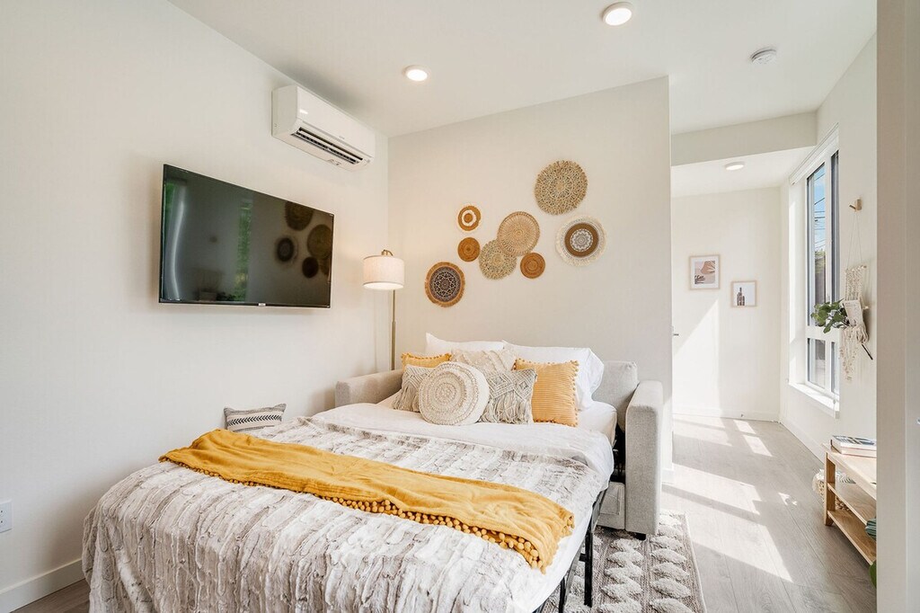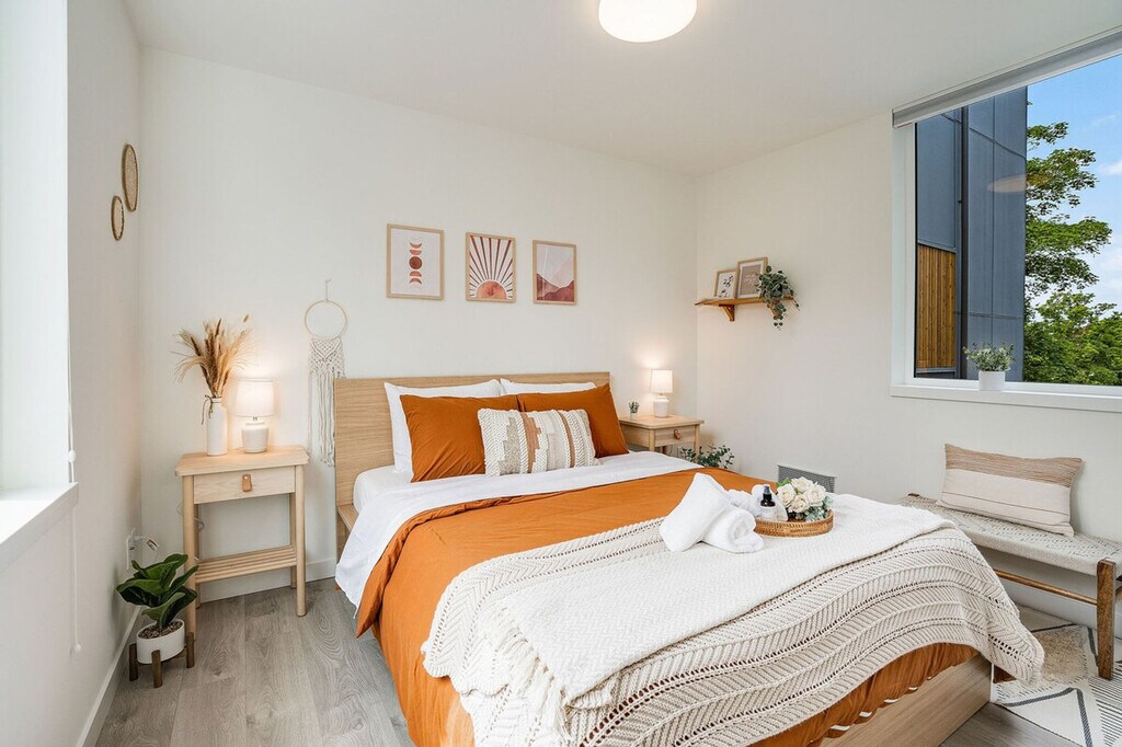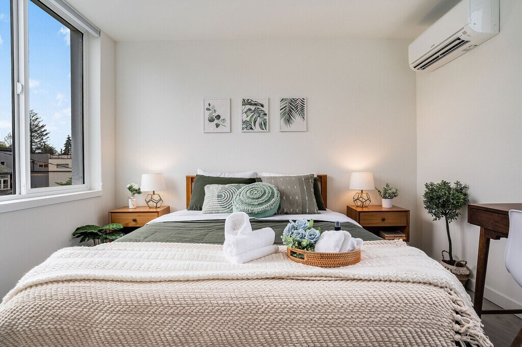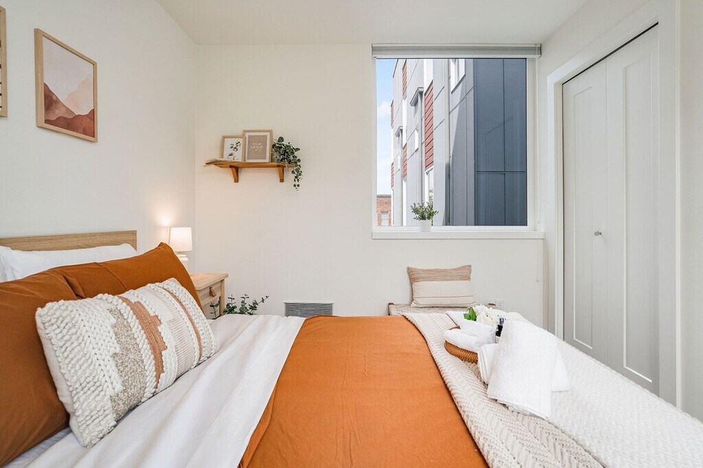 Experience the charm of Seattle in this modern townhome, ideally located within a 10-minute reach of Amazon, Meta, UW, and Pike Place Market. Nestled in a vibrant neighborhood, this 4-story townhome offers 956 sqft of living space, including a rooftop patio. While the entrance features a few steps, the home provides a seamless blend of convenience and tranquility. This recently constructed townhome boasts a thoughtfully designed layout with two bedrooms and two bathrooms spread across different levels, making it perfect for group travel. The first floor features a living room with a queen sofa sleeper, a fully equipped kitchen, and a dining area, all air-conditioned for your comfort. The second floor houses a bedroom with a queen bed and a hallway bath with a bathtub and shower combo. The primary bedroom on the third floor includes a queen bed and an ensuite bathroom with a shower, also air-conditioned. Enjoy the rooftop patio with outdoor seating for an al fresco experience. While the home does not have dedicated parking, a city-issued guest parking permit is provided for free street parking. However, street parking is first-come-first-served and can be challenging to find in the densely populated Capitol Hill area. Paid public parking is available nearby. Well-trained pets are welcome with a fee of $50 per pet per night. Additional guest fees apply for more than four guests, at $25 per person per night, up to a maximum of six guests. Located in the iconic Pike/Pine Corridor of Capitol Hill, this neighborhood is a hub for food, music, and nightlife. With excellent brunch spots, coffee shops, dining, shopping, and award-winning bars, you'll find everything you need within walking distance. The Capitol Hill Light Rail Station is just minutes away, offering easy access to other parts of the city, including the airport. Ride-sharing services like Uber and Lyft are also highly recommended for getting around. Construction on 14th Ave is ongoing from Monday to Friday, starting between 7:00 AM and 8:00 AM and ending between 5:00 PM and 6:00 PM. For safety, refrain from parking in front of the construction site during these hours. The townhome is not handicap friendly and requires comfort with stairs due to its multiple stories. Strictly no parties or events are allowed, and quiet hours are enforced between 10 PM and 8 AM. Smoking or vaping of any kind is prohibited on the property, including outdoor areas, with a $500 fine per violation. The townhome is equipped with high-speed internet, with download speeds up to 1200 Mbps, making it ideal for streaming or remote work needs. A smart TV is also available for entertainment. Registration Number: STR-OPLI-22-000944 [SI]
