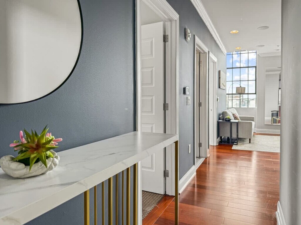 This charming apartment is nestled in a vibrant neighborhood, providing a peaceful retreat in the heart of the city. Close to bustling streets and historic landmarks, it's ideal for solo travelers or couples seeking a tranquil stay while exploring the city's attractions. This inviting 2-bedroom apartment is thoughtfully designed to cater to all your needs for a carefree and enjoyable stay. Each bedroom is elegantly furnished with a queen bed, ensuring a restful night's sleep with high-quality linens, cozy pillows, and ample closet space for your belongings. Equipped with a comfortable desk and chair to ensure you can work for extended periods without discomfort. The living room features a stylish and comfortable sofa, seamlessly integrated into the space. The kitchen is outfitted with state-of-the-art stainless steel appliances, including a refrigerator, oven, stove, microwave, and dishwasher. These modern conveniences make cooking and cleanup a breeze. The bathroom features a contemporary design with clean lines and high-quality finishes. The elegant décor and thoughtful layout create a serene and inviting atmosphere. Pets are allowed depending on size, and a pet cleaning fee applies: for 1-4 nights, $25 per night, for 5-29 nights, $200, and for 30+ nights, $300. Surveillance cameras are in the hallways for security. The pool will be closed during the winter season and will reopen next summer. Experience the best of Philadelphia from this stylish urban apartment. Whether you’re visiting for business or leisure, this apartment ensures your stay is memorable and enjoyable. There is a Minut device in the unit for noise level monitoring. No shoes are allowed in the house and guests are asked to do their dishes before leaving. No smoking is allowed, and if there is evidence of smoking indoors, a $500 fine will be imposed. Includes a comfortable desk and chair to ensure you can work for extended periods without discomfort. [SI]