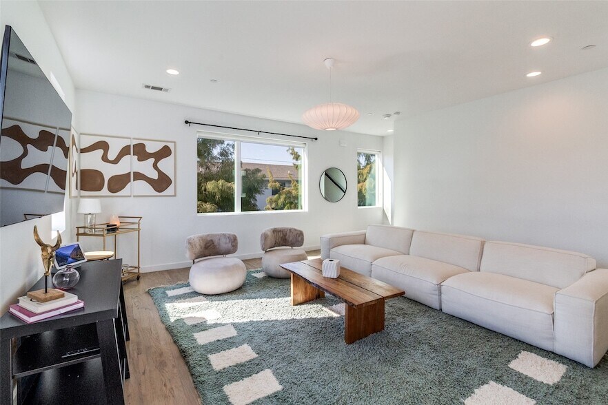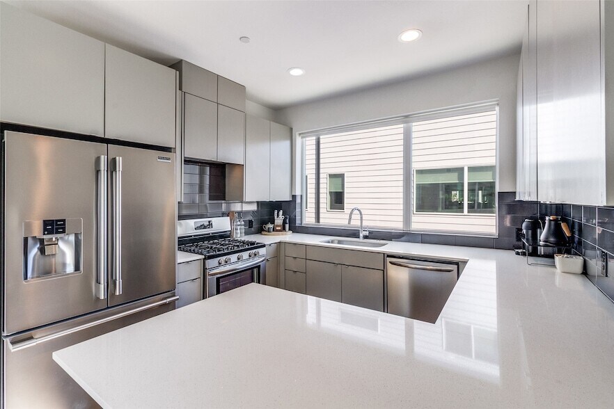 Modern corner-unit townhome in the heart of Old East Dallas, offering a bright, open layout and sleek contemporary finishes. Natural light fills the home through large corner windows, highlighting real hardwood flooring, recessed lighting, and clean architectural lines. The kitchen impresses with quartz countertops, flat-panel cabinetry, and stainless steel Frigidaire Gallery appliances including a gas range. Both bedrooms feature ensuite baths, with the primary suite offering dual sinks, a walk-in shower, and generous closet space. Enjoy your morning coffee or let your dog play in the private fenced yard, and appreciate the convenience of an attached two-car garage. Refrigerator, washer, and dryer are included. Close to Knox Henderson, Lower Greenville, and Uptown, this stylish townhome blends modern design with prime Dallas living.