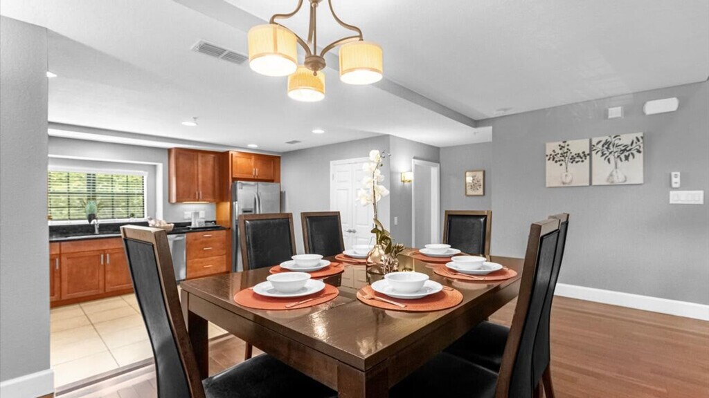 Step into a beautifully designed, split-level townhome that blends stylish modern décor with practical comfort across three spacious stories. Whether you're here to relax or explore, this thoughtfully crafted space offers the perfect balance of luxury and convenience. The townhome features 4 bedrooms and 3.5 bathrooms, making it ideal for families or group stays. This townhome welcomes you with a gourmet kitchen that includes granite countertops and high-end stainless steel appliances. The open-concept living and dining areas are perfect for entertaining or relaxing, while the elegant interiors with contemporary design touches add a touch of sophistication. The master bedroom and one of the other bedrooms each feature a queen-size bed and a private en-suite bathroom, while the other two bedrooms each have a full-size bed and share a bathroom. Pets are welcome with a pet fee, and only dogs are allowed with a maximum of two per reservation. The townhome offers two designated parking spots in the carport, with extra free parking spots available by the gate. Located in the vibrant neighborhood of Lake Buena Vista, this townhome is just 1.5 miles from Disney, offering quick access to Orlando's top attractions and Central Florida hotspots. The area is renowned for its close proximity to world-famous theme parks and entertainment complexes, including Disney's Magic Kingdom, EPCOT, and Universal Orlando Resort. With convenient access to major roads like Interstate 4 and the Beachline Expressway, exploring the area is a breeze. Quiet hours are between 22:00 and 8:00. Please comply with the parking regulations, and ensure the A/C temperature remains set at or above 72ºF to prevent system issues. Messages will be replied to within 20 minutes to ensure a seamless check-in experience. [SI]
