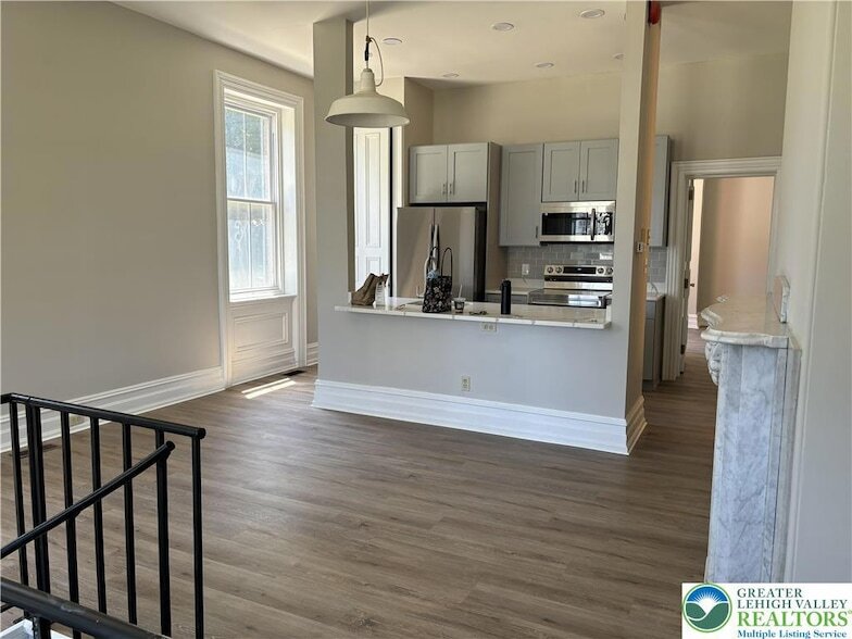 Welcome to 146 S Church St, Apt 1 a unique two-story apartment offering a spacious, open layout and distinctive character. The first floor features a comfortable bedroom with a convenient half bath, along with a striking spiral staircase that leads to the upper level. Upstairs, you ll find an open-concept kitchen and living area filled with natural light, a full bathroom, and a second bedroom highlighted by large bay windows. This home comes fully equipped with appliances including a refrigerator, dishwasher, microwave, oven, and garbage disposal. The unit also features electric heating and cooling for year-round comfort. A perfect blend of style, space, and functionality this apartment is a must-see.