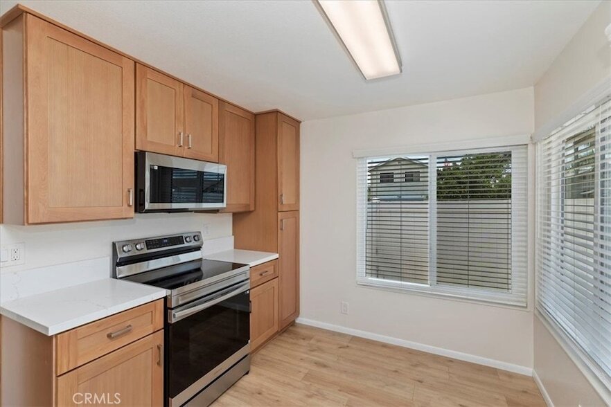 Welcome to this beautifully remodeled single-story home situated on a spacious corner lot in one of Irvine s most sought-after neighborhoods. This like-new residence features 3 bedrooms and 2 full bathrooms, with nearly every detail thoughtfully updated.The stunning kitchen has been completely renovated with custom White Oak cabinetry, sleek quartz countertops, stainless steel appliances, a deep stainless steel sink, refrigerator, and soft-close drawers perfect for the modern chef. The home also boasts new luxury vinyl plank flooring throughout, dual-pane windows, updated lighting, fresh interior and exterior paint, ceiling fans, mirrored closet doors and wood burning fireplace.Enjoy the privacy and space of a large lot, just steps from neighborhood parks, scenic walking trails, and within walking distance to award-winning schools, including Irvine High School. Located in a top-tier school district and close to everything Irvine has to offer, this home is truly a rare find!