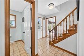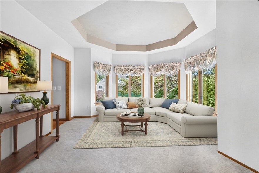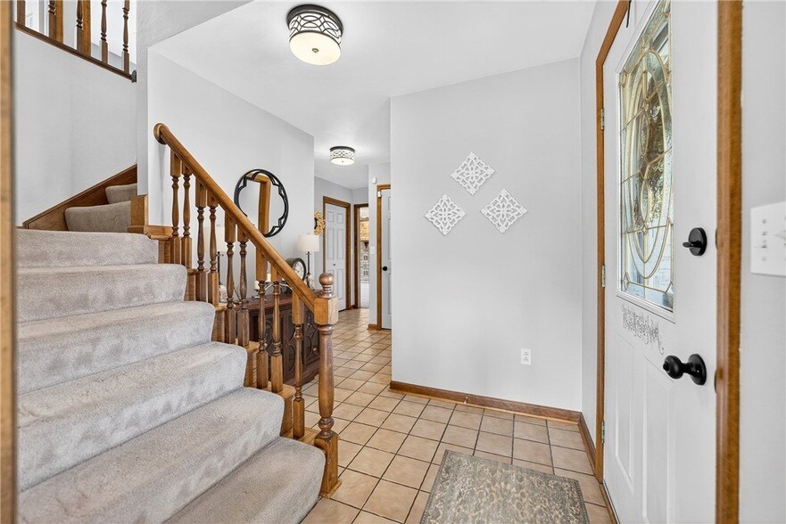 This architecturally designed two-story home welcomes you with a striking two-story entrance and an abundance of natural light. The main level features a spacious living room with a walk-out bay window, and a cozy family room highlighted by a gas fireplace and multiple windows overlooking the landscaped backyard. The chef-inspired kitchen is outfitted with sleek quartz countertops, a stylish ceramic tile backsplash, LG Appliances and double pantries. A two-tiered deck off the kitchen is perfect for outdoor entertaining.Upstairs, convenience meets luxury with a second-floor laundry and a primary suite complete with a private ensuite bath. Three additional bedrooms complete that level. The finished lower level offers a versatile game room, den, full bath, and walk-out access, ideal for relaxation or entertaining. Surrounded by mature trees and located close to shopping, schools, and PT Municipal Park, this home blends elegance, comfort, and convenience in one exceptional package.