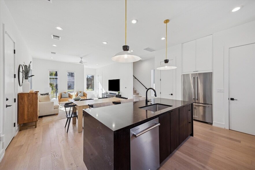 Stylish, multi-level home offering a flexible and thoughtfully designed layout in a highly desirable Austin location. The first level features an open-concept living room, dining area, and kitchen, creating an inviting space for everyday living and entertaining, with direct access to a fully fenced backyard. The second level includes a spacious primary suite with dual-vanity en suite bath, a secondary bedroom with its own en suite bathroom, and a convenient laundry closet. The third level offers an additional living area and a third bedroom with en suite bath, ideal for a guest suite, home office, or flex space. Contemporary updates, abundant natural light, and clean modern finishes are found throughout. Ideally located near some of Austin s best dining, coffee shops, entertainment, and outdoor spaces, with easy access to major roads for a quick commute around the city.