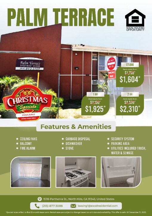 Property Id: 2295654 Welcome to Palm Terrace - 2 Bedroom / 2 Bath Apartments 15116 Parthenia St, North Hills, CA 91343 Special Offer: Get one month free with a 12-month lease, valid through December 31, 2025 Rent Details: Base Rent: $2,520 Advertised Rent (After Concession): $2,310 Please note: The advertised rent reflects the concession; the base rent remains $2,520 Prices and offers are subject to change Apartment Features: 2 Bedrooms / 2 Bathrooms Air Conditioning Spacious Closets Fully Equipped Kitchen Community Amenities: Laundry Facilities Covered Parking Responsive On-Site Maintenance Friendly, Professional Staff Leasing Office Hours: Monday-Friday, 9:00 AM - 5:30 PM Palm Terrace offers comfortable, well-maintained apartments in North Hills, ideal for families, professionals, and commuters. Apartments are leasing quickly - schedule your tour today!