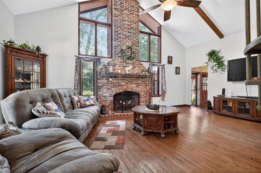 Prepare to fall in love with privacy, character, and pure Florida charm. Tucked away in the sought-after Glenwood area of DeLand, this incredible brick home sits deep off the road on 1.5 acres, framed by two circular driveways and a long private drive that creates a true estate-like arrival. With Lake Woodruff National Wildlife Refuge and its bird sanctuary right next door, nature lovers will feel like they ve discovered their own hidden paradise. Step inside and discover a home filled with warmth and personality. The living room impresses instantly with a soaring 16-foot cathedral ceiling accented by cedar beams and a stunning brick fireplace as the focal point. The kitchen features rich wood cabinetry, stainless steel appliances, and a cozy breakfast nook, while an inside laundry room with washer and dryer offers great convenience. A door off the kitchen opens to a large carport for easy covered access. A spiral staircase leads to the loft complete with built-in desk and shelving perfect for a home office or creative nook. Just beyond is the private upstairs primary suite, offering a walk-in closet and its own balcony overlooking the tranquil backyard. Downstairs, two additional bedrooms open to a charming glass-enclosed Florida room with Spanish tile flooring an ideal spot to enjoy morning coffee or peaceful evening views. Love the outdoors? You re in luck. Enjoy evenings around the propane fire pit in the custom gazebo, complete with beautifully carved wood benches by a local artist. The oversized garage is a dream, offering 900 sq ft of open main space plus an extra 300 sq ft with its own entrance and two bonus rooms perfect for hobbies, storage, or a workshop. With a 2024 roof, updated well, and lush scenery everywhere you look, this home is as special as they come. Experience serenity, space, and style welcome to your Glenwood retreat.