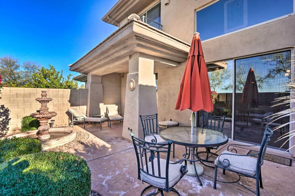 Feel at home in this luxurious 3-bedroom, 3-bath Scottsdale townhome. There is one small step to access the property. This townhome features a spacious and fully stocked kitchen, 2 balconies, and a private backyard where you can peacefully lounge by the fountain and dine with family. The kitchen includes a wall oven, stove top, refrigerator, microwave, dishwasher, dishware and flatware, cooking basics, a breakfast bar, spacious counters, spices, a coffee maker, toaster, Crockpot, blender, ice maker, and a water filter. Other amenities include smart TVs, 2 dining tables, vaulted ceilings, ceiling fans, en-suite bathrooms, walk-in closets, free Wi-Fi, central air conditioning and heat, towels and linens, a washer and dryer, laundry detergent, an iron and board, hangers, hair dryers, trash bags and paper towels, and keyless entry. Enjoy swimming in Kierland’s heated community pool. Parking is available in the garage for 2 vehicles. You can conveniently walk to shopping malls, the golf course, and grocery stores. Quiet hours are from 10:00 PM to 6:00 AM. No smoking, pets, events, parties, or large gatherings are allowed. This property features a Ring Doorbell device with an exterior security camera facing the front outdoor entry that records video and sound when motion is detected or when the doorbell button is pressed. [SI]
