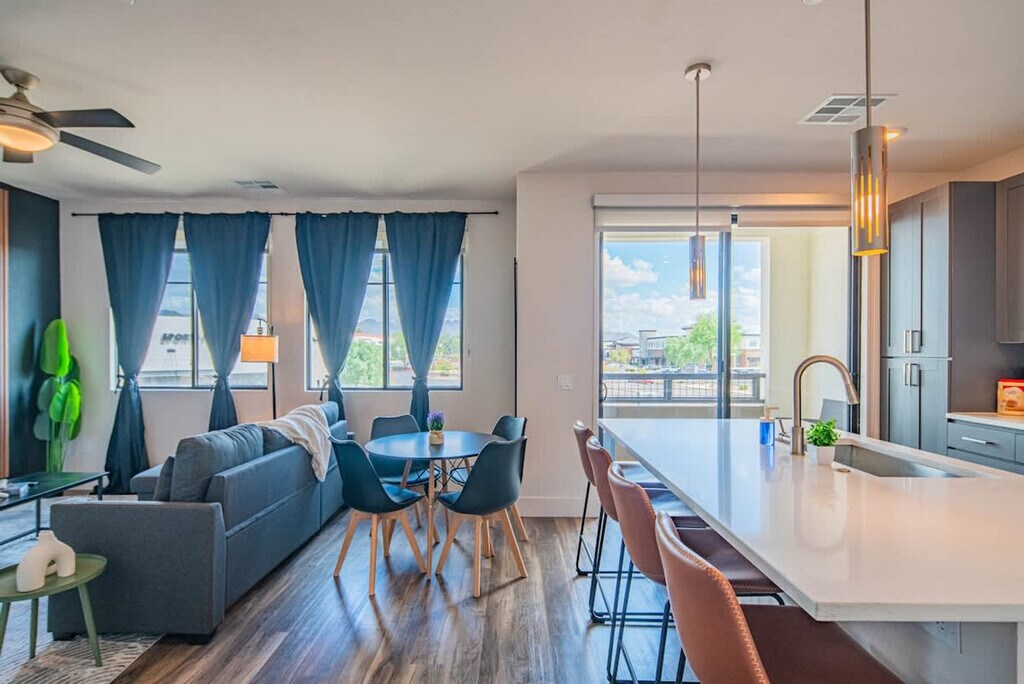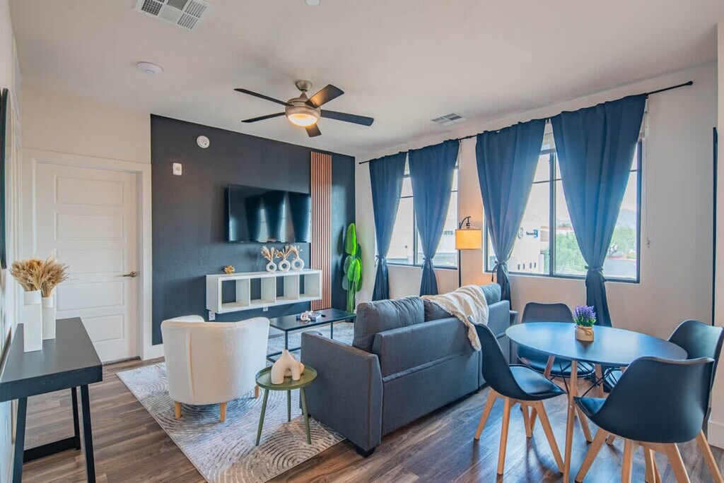 Unwind in this elegant Scottsdale apartment, perfectly located near award-winning restaurants, shops, historic landmarks, golf, and top attractions. From this prime spot, exploring Arizona is easy and convenient. After a day of dining, shopping, or adventures, return to your cozy retreat to unwind and recharge in comfort. The apartment includes one parking spot, with additional parking options available nearby. Come relax in this 1-bedroom, 1-bathroom unit. The living space features an innovative open-concept design that blends the living and dining areas with the kitchen, creating a modern and sleek living experience. The living room is ideal for relaxing and enjoying the company of friends and family while watching a good movie or a show. The apartment features a fully equipped kitchen where you can easily prepare your favorite meals. The inviting full bathroom is completely private and stocked with all essential toiletries. Pets are allowed depending on size or if they are service animals. An additional cleaning fee is required per pet: $25 per night for 1-7 nights, $200 for 8-29 nights, and $300 for 30+ nights. There is a 2-pet maximum and only cats and dogs are allowed. If pets are found without prior notification, there will be a $500 fee. Early check-in/check-out may be accommodated at a fee of $25 per hour. A $500 late check-out fee applies if not arranged in advance. Lost or unreturned keys incur a $500 fee. Nestled in the heart of Scottsdale, this apartment offers a perfect blend of comfort and convenience. Enjoy a peaceful stay in this upscale, residential area where tree-lined streets and well-maintained properties create a tranquil environment perfect for relaxation. The nearby McDowell Sonoran Preserve offers miles of scenic hiking trails and stunning desert vistas. Just a short drive away, you'll find Scottsdale's vibrant dining scene and trendy boutiques. With several world-class golf courses nearby, you can enjoy a round of golf surrounded by breathtaking desert landscapes. Scottsdale is known for its rich cultural scene, including art galleries, museums, and unique festivals. Quiet hours are between 10pm and 8am every day. Violations may result in cancellation of booking and removal from the property without refund. No parties or events are allowed. If a party is detected, the police will be called and guests will be removed without refund. No unauthorized guests are allowed, with a $100 fine per guest if discovered. Smoking is prohibited on this property, including balconies and around the building. A $500 fine will be imposed for any signs of smoking. Noise monitors are installed to measure noise levels, and tampering with them will incur a fee. Security cameras are in the hallways for safety. Regular pest control is conducted, but occasional small bugs may be noticed due to seasonal changes. The bedroom includes an office desk and chair, providing a comfortable space for remote work. High-speed Wi-Fi is available to ensure a seamless work-from-home experience. [SI]
