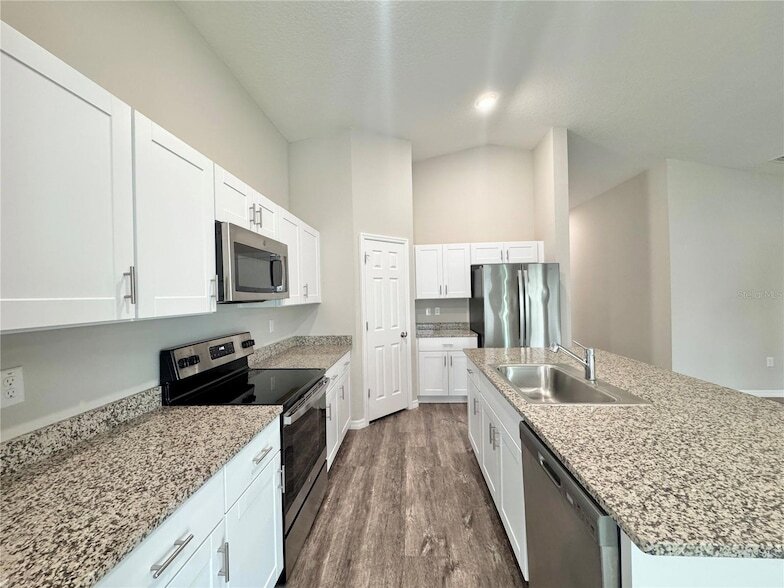 Welcome to your next home in the Pinnacle Point community! This 2023 Casa Fresca, 'Valeria model, is ready for immediate move-in. The thoughtfully design features an open great room, a secluded master suite, two bedrooms with a shared guest bath near the front entrance, and the fourth bedroom privately situated off the garage and inside laundry room. Long foyer entrance opening up to the kitchen overlooking the great room with dining area adjacent, creating a perfect space for entertaining or hosting. Kitchen equipped with stainless steel appliances, elegant granite countertops, and large 3.5x6 walk-in closet pantry. Enjoy seamless indoor-outdoor living with access from the dining area to the 14x10 covered lanai. Primary suite includes dual sinks, walk-in shower, private commode, spacious 7x10 walk-in closet, and linen closet. Located near Publix and just 4 miles East of the Polk Parkway for quick access into Lakeland or I4.